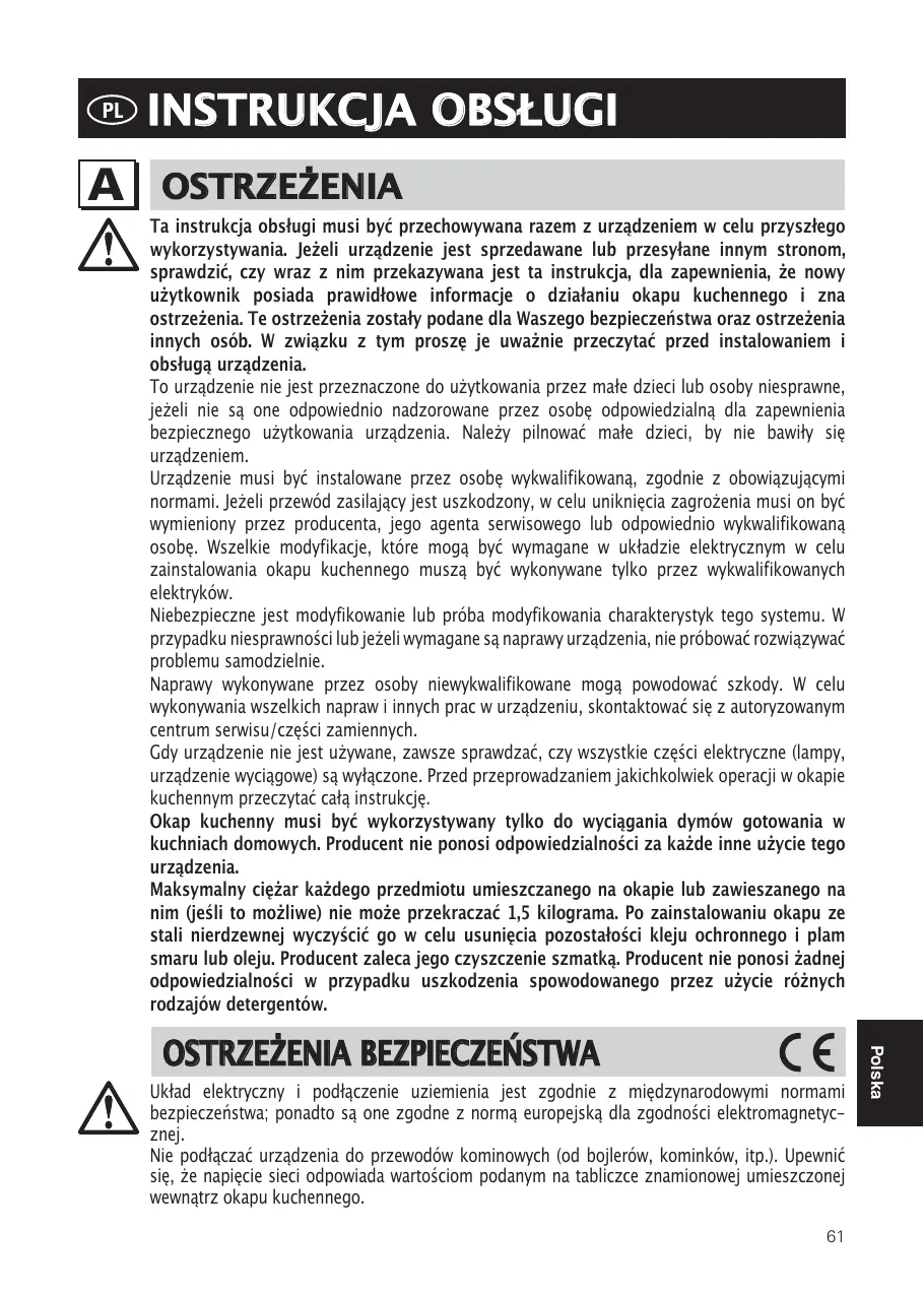 OSTRZEŻENIA Ta instrukcja obsługi musi być przechowywana razem z urządzeniem w celu przyszłego wykorzystywania. Jeżeli urządzenie jest sprzedawane lub przesyłane innym stronom, sprawdzić, czy wraz z nim przekazywana jest ta instrukcja, dla zapewnienia, że nowy użytkownik posiada prawidłowe informacje o działaniu okapu kuchennego i zna ostrzeżenia. Te ostrzeżenia zostały podane dla Waszego bezpieczeństwa oraz ostrzeżenia innych osób. W związku z tym proszę je uważnie przeczytać przed instalowaniem i obsługą urządzenia. To urządzenie nie jest przeznaczone do użytkowania przez małe dzieci lub osoby niesprawne, jeżeli nie są one odpowiednio nadzorowane przez osobę odpowiedzialną dla zapewnienia bezpiecznego użytkowania urządzenia. Należy pilnować małe dzieci, by nie bawiły się urządzeniem. Urządzenie musi być instalowane przez osobę wykwalifikowaną, zgodnie z obowiązującymi normami. Jeżeli przewód zasilający jest uszkodzony, w celu uniknięcia zagrożenia musi on być wymieniony przez producenta, jego agenta serwisowego lub odpowiednio wykwalifikowaną osobę. Wszelkie modyfikacje, które mogą być wymagane w układzie elektrycznym w celu zainstalowania okapu kuchennego muszą być wykonywane tylko przez wykwalifikowanych elektryków. Niebezpieczne jest modyfikowanie lub próba modyfikowania charakterystyk tego systemu. W przypadku niesprawności lub jeżeli wymagane są naprawy urządzenia, nie próbować rozwiązywać problemu samodzielnie. Naprawy wykonywane przez osoby niewykwalifikowane mogą powodować szkody. W celu wykonywania wszelkich napraw i innych prac w urządzeniu, skontaktować się z autoryzowanym centrum serwisu/części zamiennych. Gdy urządzenie nie jest używane, zawsze sprawdzać, czy wszystkie części elektryczne (lampy, urządzenie wyciągowe) są wyłączone. Przed przeprowadzaniem jakichkolwiek operacji w okapie kuchennym przeczytać całą instrukcję. Okap kuchenny musi być wykorzystywany tylko do wyciągania dymów gotowania w kuchniach domowych. Producent nie ponosi odpowiedzialności za każde inne użycie tego urządzenia. Maksymalny ciężar każdego przedmiotu umieszczanego na okapie lub zawieszanego na nim (jeśli to możliwe) nie może przekraczać 1,5 kilograma. Po zainstalowaniu okapu ze stali nierdzewnej wyczyścić go w celu usunięcia pozostałości kleju ochronnego i plam smaru lub oleju. Producent zaleca jego czyszczenie szmatką. Producent nie ponosi żadnej odpowiedzialności w przypadku uszkodzenia spowodowanego przez użycie różnych rodzajów detergentów. Układ elektryczny i podłączenie uziemienia jest zgodnie z międzynarodowymi normami bezpieczeństwa; ponadto są one zgodne z normą europejską dla zgodności elektromagnetycznej. Nie podłączać urządzenia do przewodów kominowych (od bojlerów, kominków, itp.). Upewnić się, że napięcie sieci odpowiada wartościom podanym na tabliczce znamionowej umieszczonej wewnątrz okapu kuchennego.