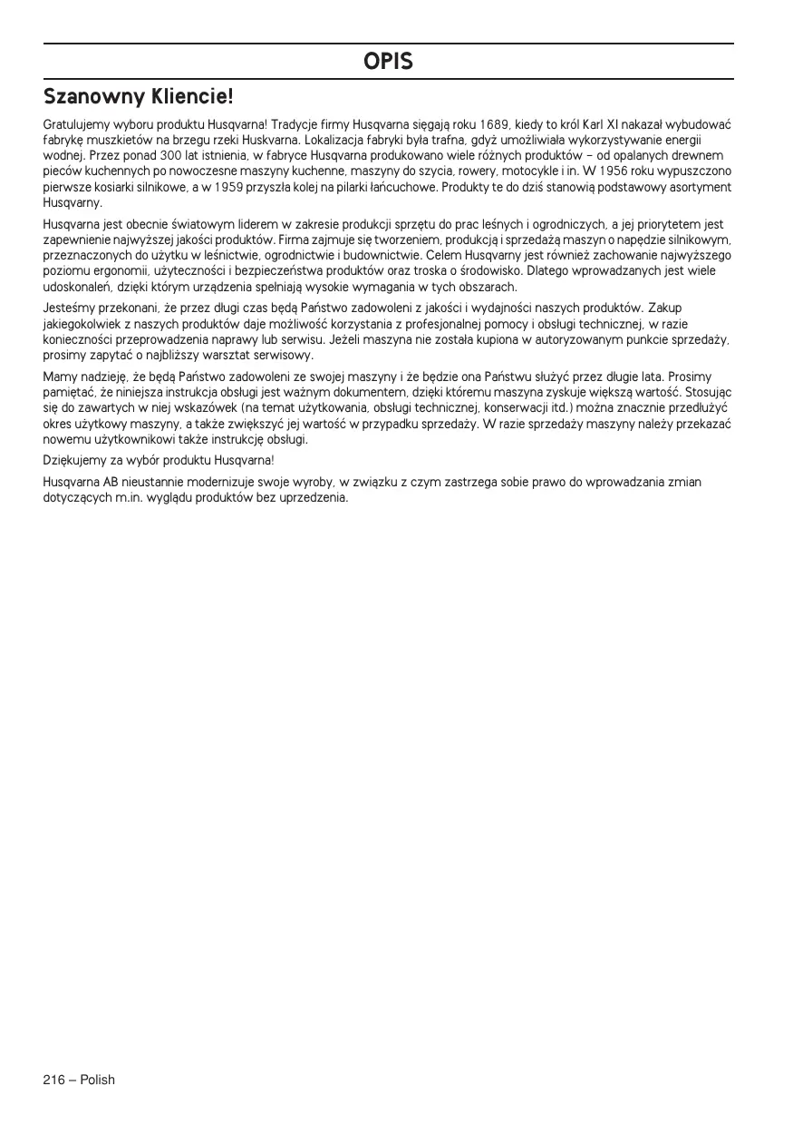 OPIS Szanowny Kliencie! Gratulujemy wyboru produktu Husqvarna! Tradycje firmy Husqvarna si´gajà roku 1689, kiedy to król Karl XI nakaza∏ wybudowaç fabryk´ muszkietów na brzegu rzeki Huskvarna. Lokalizacja fabryki by∏a trafna, gdy˝ umo˝liwia∏a wykorzystywanie energii wodnej. Przez ponad 300 lat istnienia, w fabryce Husqvarna produkowano wiele ró˝nych produktów - od opalanych drewnem pieców kuchennych po nowoczesne maszyny kuchenne, maszyny do szycia, rowery, motocykle i in. W 1956 roku wypuszczono pierwsze kosiarki silnikowe, a w 1959 przysz∏a kolej na pilarki ∏aƒcuchowe. Produkty te do dziÊ stanowià podstawowy asortyment Husqvarny. Husqvarna jest obecnie Êwiatowym liderem w zakresie produkcji sprz´tu do prac leÊnych i ogrodniczych, a jej priorytetem jest zapewnienie najwy˝szej jakoÊci produktów. Firma zajmuje si´ tworzeniem, produkcjà i sprzeda˝à maszyn o nap´dzie silnikowym, przeznaczonych do u˝ytku w leÊnictwie, ogrodnictwie i budownictwie. Celem Husqvarny jest równie˝ zachowanie najwy˝szego poziomu ergonomii, u˝ytecznoÊci i bezpieczeƒstwa produktów oraz troska o Êrodowisko. Dlatego wprowadzanych jest wiele udoskonaleƒ, dzi´ki którym urzàdzenia spe∏niajà wysokie wymagania w tych obszarach. JesteÊmy przekonani, ˝e przez d∏ugi czas b´dà Paƒstwo zadowoleni z jakoÊci i wydajnoÊci naszych produktów. Zakup jakiegokolwiek z naszych produktów daje mo˝liwoÊç korzystania z profesjonalnej pomocy i obs∏ugi technicznej, w razie koniecznoÊci przeprowadzenia naprawy lub serwisu. Je˝eli maszyna nie zosta∏a kupiona w autoryzowanym punkcie sprzeda˝y, prosimy zapytaç o najbli˝szy warsztat serwisowy. Mamy nadziej´, ˝e b´dà Paƒstwo zadowoleni ze swojej maszyny i ˝e b´dzie ona Paƒstwu s∏u˝yç przez d∏ugie lata. Prosimy pami´taç, ˝e niniejsza instrukcja obs∏ugi jest wa˝nym dokumentem, dzi´ki któremu maszyna zyskuje wi´kszà wartoÊç. Stosujàc si´ do zawartych w niej wskazówek (na temat u˝ytkowania, obs∏ugi technicznej, konserwacji itd.) mo˝na znacznie przed∏u˝yç okres u˝ytkowy maszyny, a tak˝e zwi´kszyç jej wartoÊç w przypadku sprzeda˝y. W razie sprzeda˝y maszyny nale˝y przekazaç nowemu u˝ytkownikowi tak˝e instrukcj´ obs∏ugi. Dzi´kujemy za wybór produktu Husqvarna! Husqvarna AB nieustannie modernizuje swoje wyroby, w zwiàzku z czym zastrzega sobie prawo do wprowadzania zmian dotyczàcych m.in. wyglàdu produktów bez uprzedzenia.
