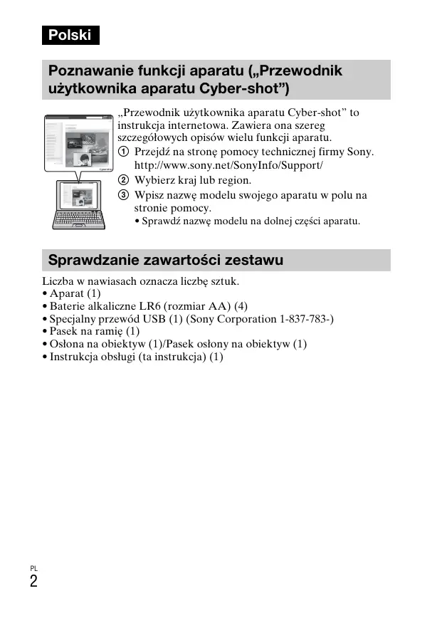 Polski Poznawanie funkcji aparatu („Przewodnik użytkownika aparatu Cyber-shot”) „Przewodnik użytkownika aparatu Cyber-shot” to instrukcja internetowa. Zawiera ona szereg szczegółowych opisów wielu funkcji aparatu. 1 Przejdź na stronę pomocy technicznej firmy Sony. http://www.sony.net/SonyInfo/Support/ 2 Wybierz kraj lub region. 3 Wpisz nazwę modelu swojego aparatu w polu na stronie pomocy. • Sprawdź nazwę modelu na dolnej części aparatu.