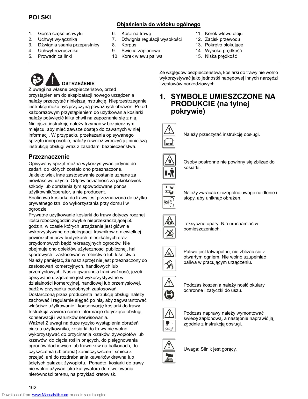 Przeznaczenie Opisywany sprzęt można wykorzystywać jedynie do zadań, do których zostało ono przeznaczone. Jakiekolwiek inne zastosowanie zostanie uznane za niewłaściwe użycie. Odpowiedzialność za jakiekolwiek szkody lub obrażenia tym spowodowane ponosi użytkownik/operator, a nie producent. Spalinowa kosiarka do trawy jest przeznaczona do użytku prywatnego tzn. do wykorzystania przy domu i w ogrodzie. Prywatne użytkowanie kosiarki do trawy dotyczy rocznej ilości roboczogodzin zwykle nieprzekraczającej 50 godzin, w czasie których urządzenie jest głównie wykorzystywane do pielęgnacji trawników o niewielkiej powierzchni przy budynkach mieszkalnych oraz przydomowych bądź rekreacyjnych ogrodów. Nie obejmuje ono obiektów użyteczności publicznej, hal sportowych i zastosowań w rolnictwie lub leśnictwie. Należy pamiętać, że nasz sprzęt nie jest przeznaczony do zastosowań komercyjnych, handlowych lub przemysłowych. Nasza gwarancja traci ważność, jeżeli opisywane urządzenie jest wykorzystywane w działalności komercyjnej, handlowej lub przemysłowej, bądź w przypadku podobnych zastosowań. Dostarczoną przez producenta instrukcję obsługi należy zachować i regularnie sięgać po nią, aby zagwarantować właściwe użytkowanie i konserwację kosiarki do trawy. Instrukcja zawiera cenne informacje dotyczące obsługi, konserwacji i warunków serwisowania. Ważne! Z uwagi na duże ryzyko wystąpienia obrażeń ciała u użytkownika, kosiarki do trawy nie wolno wykorzystywać do przycinania krzaków, żywopłotów lub krzewów, do cięcia roślin pnących, do pielęgnowania ogrodów dachowych lub trawników na balkonach, do czyszczenia (zbierania) zanieczyszczeń i śmieci z przejść, ani do rozdrabniania kawałków drewna lub ściętych gałązek żywopłotu. Ponadto, kosiarki do trawy nie wolno używać jako kultywatora do niwelowania nierówności terenu, na przykład kretowisk. 162 Downloaded from www.Manualslib.com manuals search engine