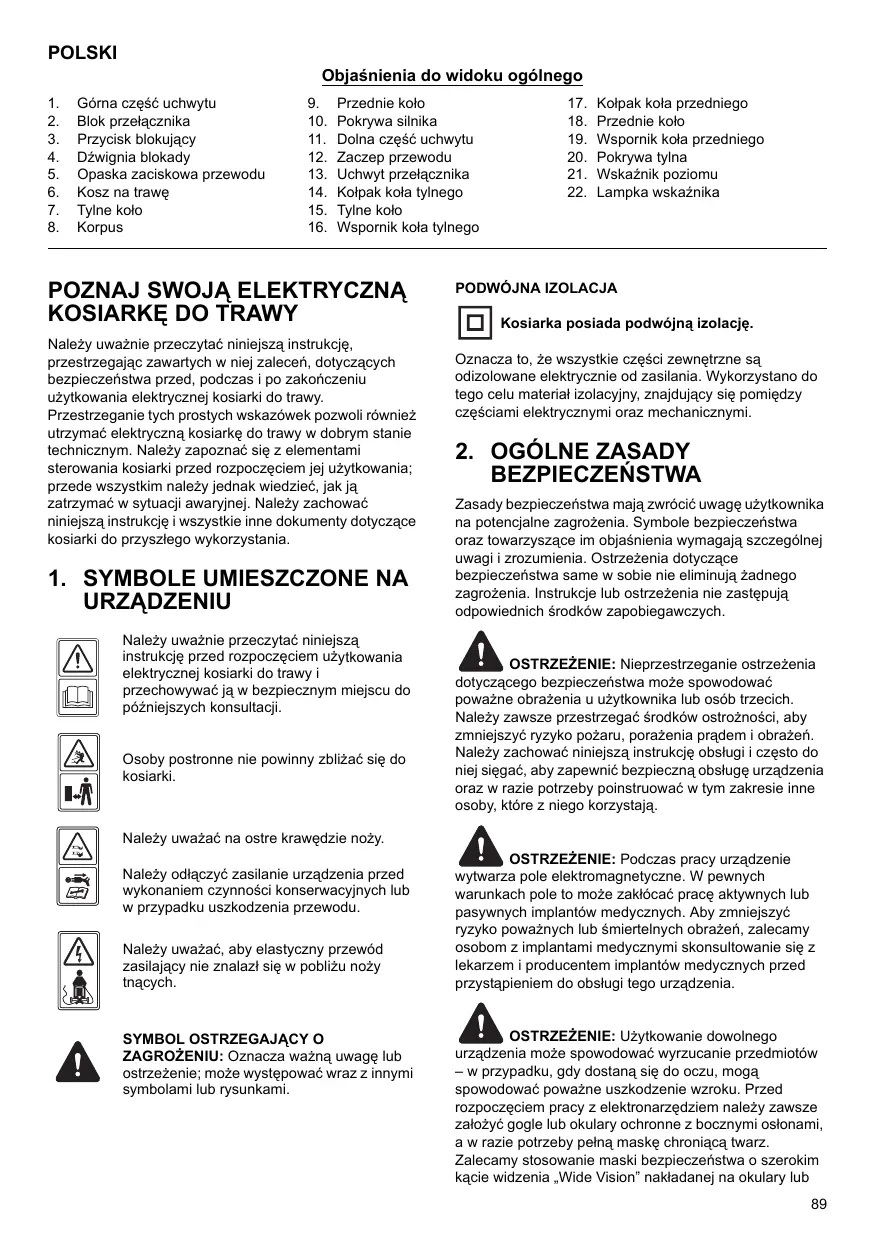 POZNAJ SWOJĄ ELEKTRYCZNĄ KOSIARKĘ DO TRAWY Należy uważnie przeczytać niniejszą instrukcję, przestrzegając zawartych w niej zaleceń, dotyczących bezpieczeństwa przed, podczas i po zakończeniu użytkowania elektrycznej kosiarki do trawy. Przestrzeganie tych prostych wskazówek pozwoli również utrzymać elektryczną kosiarkę do trawy w dobrym stanie technicznym. Należy zapoznać się z elementami sterowania kosiarki przed rozpoczęciem jej użytkowania; przede wszystkim należy jednak wiedzieć, jak ją zatrzymać w sytuacji awaryjnej. Należy zachować niniejszą instrukcję i wszystkie inne dokumenty dotyczące kosiarki do przyszłego wykorzystania.