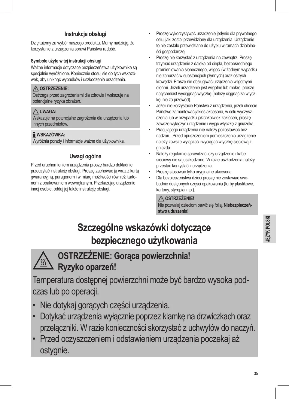OSTRZEŻENIE: Ryzyko oparzeń! Nie dotykać gorących części urządzenia. Dotykać urządzenia wyłącznie poprzez klamkę na drzwiczkach oraz przełączniki.