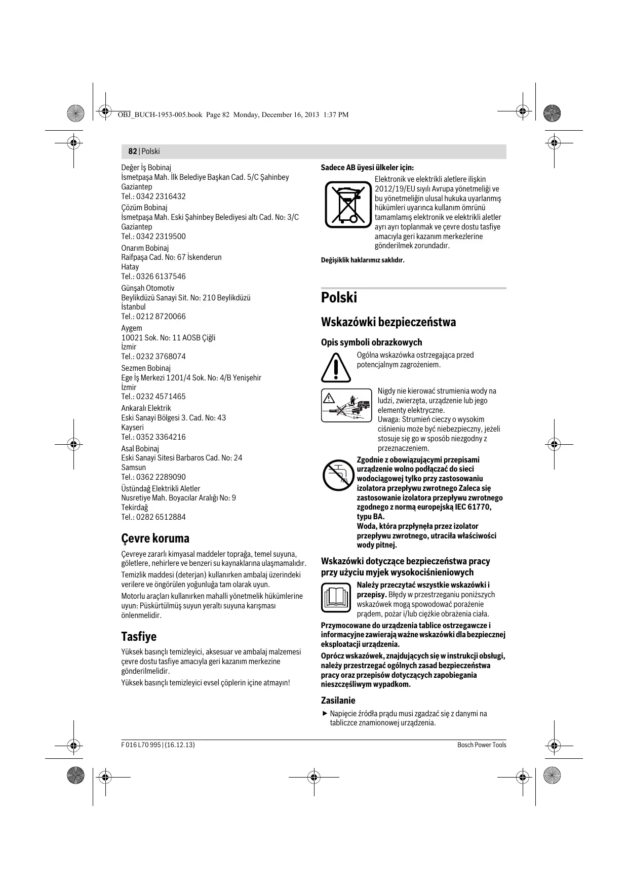 Denizli Tel.: 0258 2620666 Bulut Elektrik İstasyon Cad. No: 52/B Devlet Tiyatrosu Karşısı Elazığ Tel.: 0424 2183559 Körfez Elektrik Sanayi Çarşısı 770 Sok. No: 71 Erzincan Tel.: 0446 2230959 Ege Elektrik İnönü Bulvaro No: 135 Muğla Makasarası Fethiye Fethiye Tel.: 0252 6145701 F 016 L70 995 | (16.12.13) OBJ_BUCH-1953-005.book Page 82 Monday, December 16, 2013 1:37 PM 82 | Polski Değer İş Bobinaj İsmetpaşa Mah. İlk Belediye Başkan Cad. 5/C Şahinbey Gaziantep Tel.: 0342 2316432 Çözüm Bobinaj İsmetpaşa Mah. Eski Şahinbey Belediyesi altı Cad. No: 3/C Gaziantep Tel.: 0342 2319500 Onarım Bobinaj Raifpaşa Cad. No: 67 İskenderun Hatay Tel.: 0326 6137546 Günşah Otomotiv Beylikdüzü Sanayi Sit. No: 210 Beylikdüzü İstanbul Tel.: 0212 8720066 Aygem 10021 Sok. No: 11 AOSB Çiğli İzmir Tel.: 0232 3768074 Sezmen Bobinaj Ege İş Merkezi 1201/4 Sok. No: 4/B Yenişehir İzmir Tel.: 0232 4571465 Ankaralı Elektrik Eski Sanayi Bölgesi 3. Cad. No: 43 Kayseri Tel.: 0352 3364216 Asal Bobinaj Eski Sanayi Sitesi Barbaros Cad. No: 24 Samsun Tel.: 0362 2289090 Üstündağ Elektrikli Aletler Nusretiye Mah. Boyacılar Aralığı No: 9 Tekirdağ Tel.: 0282 6512884 Sadece AB üyesi ülkeler için: Elektronik ve elektrikli aletlere ilişkin 2012/19/EU sıyılı Avrupa yönetmeliği ve bu yönetmeliğin ulusal hukuka uyarlanmış hükümleri uyarınca kullanım ömrünü tamamlamış elektronik ve elektrikli aletler ayrı ayrı toplanmak ve çevre dostu tasfiye amacıyla geri kazanım merkezlerine gönderilmek zorundadır. Değişiklik haklarımız saklıdır. Polski Wskazówki bezpieczeństwa Opis symboli obrazkowych Ogólna wskazówka ostrzegająca przed potencjalnym zagrożeniem. Nigdy nie kierować strumienia wody na ludzi, zwierzęta, urządzenie lub jego elementy elektryczne. Uwaga: Strumień cieczy o wysokim ciśnieniu może być niebezpieczny, jeżeli stosuje się go w sposób niezgodny z przeznaczeniem. Zgodnie z obowiązującymi przepisami urządzenie wolno podłączać do sieci wodociągowej tylko przy zastosowaniu izolatora przepływu zwrotnego Zaleca się zastosowanie izolatora przepływu zwrotnego zgodnego z normą europejską IEC 61770, typu BA. Woda, która przpłynęła przez izolator przepływu zwrotnego, utraciła właściwości wody pitnej. Çevre koruma Çevreye zararlı kimyasal maddeler toprağa, temel suyuna, göletlere, nehirlere ve benzeri su kaynaklarına ulaşmamalıdır. Temizlik maddesi (deterjan) kullanırken ambalaj üzerindeki verilere ve öngörülen yoğunluğa tam olarak uyun. Motorlu araçları kullanırken mahalli yönetmelik hükümlerine uyun: Püskürtülmüş suyun yeraltı suyuna karışması önlenmelidir. Tasfiye Yüksek basınçlı temizleyici, aksesuar ve ambalaj malzemesi çevre dostu tasfiye amacıyla geri kazanım merkezine gönderilmelidir. Yüksek basınçlı temizleyici evsel çöplerin içine atmayın! Wskazówki dotyczące bezpieczeństwa pracy przy użyciu myjek wysokociśnieniowych Należy przeczytać wszystkie wskazówki i przepisy. Błędy w przestrzeganiu poniższych wskazówek mogą spowodować porażenie prądem, pożar i/lub ciężkie obrażenia ciała. Przymocowane do urządzenia tablice ostrzegawcze i informacyjne zawierają ważne wskazówki dla bezpiecznej eksploatacji urządzenia. Oprócz wskazówek, znajdujących się w instrukcji obsługi, należy przestrzegać ogólnych zasad bezpieczeństwa pracy oraz przepisów dotyczących zapobiegania nieszczęśliwym wypadkom. Zasilanie Napięcie źródła prądu musi zgadzać się z danymi na tabliczce znamionowej urządzenia. F 016 L70 995 | (16.12.13) Bosch Power Tools OBJ_BUCH-1953-005.book Page 83 Monday, December 16, 2013 1:37 PM Polski | 83 Zaleca się podłączanie urządzenia wyłącznie do gniazda zabezpieczonego w wyłącznik różnicowo-prądowy z prądem wyzwalającym równym 30 mA. W przypadku pozostawienia urządzenia bez nadzoru – nawet na krótki okres czasu – należy wyjąć wtyczkę z gniazda sieciowego. Zasilanie energią elektryczną musi odpowiadać normie IEC 60364-1. Jeżeli zaistnieje konieczność wymiany przewodu przyłączeniowego, wymianę należy zlecić bądź producentowi, bądź autoryzowanemu przez producenta punktowi serwisowemu elektronarzędzi bądź też odpowiednio przeszkolonej osobie, aby wykluczyć ryzyko zagrożenia bezpieczeństwa pracy. Nigdy nie dotykać wtyczki zasilania mokrymi rękami. Podczas pracy urządzenia nie należy wyciągać wtyczki z gniazdka. Nie wolno najeżdżać na przewód sieciowy lub na przedłużacz, zginać go lub szarpać, gdyż mogłoby to spowodować jego uszkodzenie. Chronić przewód przed działaniem wysokiej temperatury, olejem/smarami oraz ostrymi krawędziami. Nie wolno korzystać z urządzenia, jeśli któryś przewód przyłączeniowy lub ważne części urządzenia, takie jak wąż wysokociśnieniowy, pistolet natryskowy lub urządzenia zabezpieczające są uszkodzone. Uwaga: Przedłużacze niezgodne z przepisami mogą stanowić zagrożenie. Stosując przedłużacz, należy upewnić się, że wtyczka i łącznik wtykowy mają wodoszczelną budowę. Przedłużacz musi mieć przekrój zgodny z danymi podanymi w instrukcji obsługi i musi być zaopatrzony w zabezpieczenie przez rozpryskami wody. Połączenie wtykowe przewodu z przedłużaczem nie może leżeć w wodzie. W razie wymiany złącz zasilania sieciowego lub kabla przedłużającego, należy upewnić się, że nowe złącza są bryzgoszczelne i mają odpowiednią wytrzymałość mechaniczną. Podłączenie wody Przestrzegać wszystkich przepisów przedsiębiorstwa dostarczającego wodę. Wszystkie węże połączeniowe muszą mieć odpowiednio uszczelnione złączki. Wszystkie węże połączeniowe muszą mieć odpowiednio uszczelnione złączki. Należy stosować wyłącznie węże wzmocnione o średnicy wynoszącej 12,7 mm (1/2"). Nie wolno podłączać urządzenia do źródła zaopatrzenia w wodę pitną bez zaworu zwrotnego. 