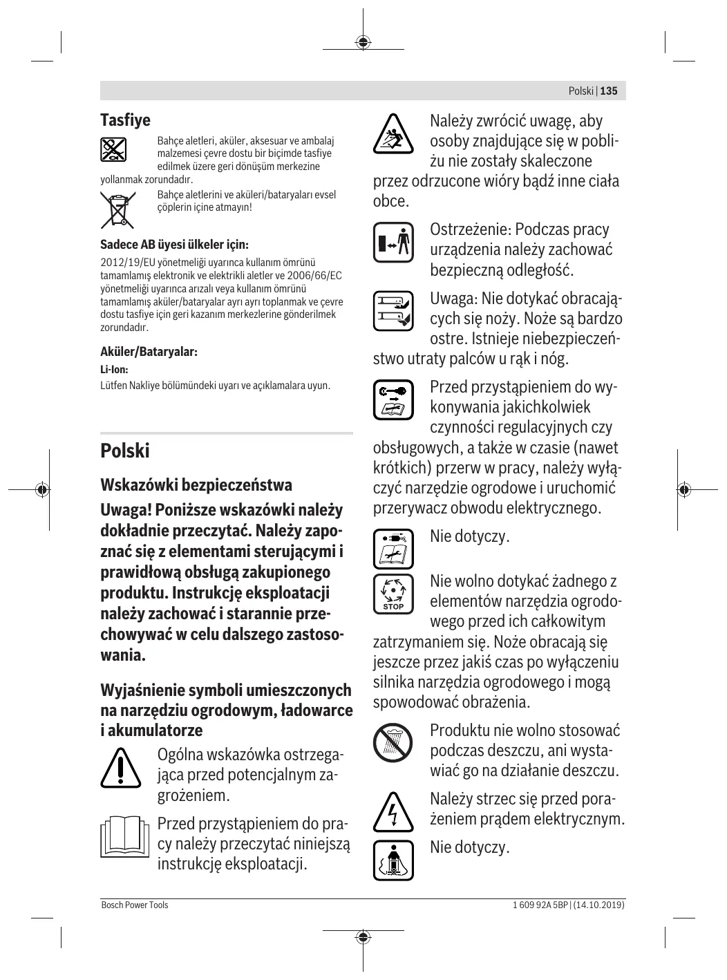 Bosch Power Tools Şebeke fişini tam olarak prize takın Şebeke gerilimini kontrol edin, gerekiyorsa şarj cihazını Bosch elektrikli el aletleri için yetkili bir serviste kontrol ettirin – Akünün havalandırma aralıklarını düzenli olarak yumuşak, temiz ve kuru bir fırça ile temizleyin. Şarj işleminden sonra belirgin ölçüde kısa işletme süresi akünün kullanım ömrünün tamamlandığını ve yenilenmesi gerektiğini gösterir. Müşteri servisi ve uygulama danışmanlığı www.bosch-garden.com Bütün başvuru ve yedek parça siparişlerinizde ürünün tip etiketi üzerindeki 10 haneli ürün kodunu mutlaka belirtin. Sadece Türkiye için geçerlidir: Bosch genel olarak yedek parçaları 5 yıl hazır tutar. Türkçe Bosch Sanayi ve Ticaret A.Ş. Elektrikli El Aletleri Aydınevler Mah. İnönü Cad. No: 20 Küçükyalı Ofis Park A Blok 1 609 92A 5BP | (14.10.2019) 134 | Türkçe 34854 Maltepe-İstanbul Tel.: 444 80 10 Fax: +90 216 432 00 82 E-mail: iletisim@bosch.com.tr www.bosch.com.tr Bulsan Elektrik İstanbul Cad. Devrez Sok. İstanbul Çarşısı No: 48/29 İskitler Ankara Tel.: +90 312 3415142 Tel.: +90 312 3410302 Fax: +90 312 3410203 E-mail: bulsanbobinaj@gmail.com Faz Makine Bobinaj Cumhuriyet Mah. Sanayi Sitesi Motor İşleri Bölümü 663 Sk. No:18 Antalya Tel.: +90 242 3465876 Tel.: +90 242 3462885 Fax: +90 242 3341980 E-mail: info@fazmakina.com.tr Körfez Elektrik Karaağaç Mah. Sümerbank Cad. No:18/2 Erzincan Tel.: +90 446 2230959 Fax: +90 446 2240132 E-mail: bilgi@korfezelektrik.com.tr Değer İş Bobinaj İsmetpaşa Mah. İlk Belediye Başkan Cad. 5/C Şahinbey/Gaziantep Tel.: +90 342 2316432 Fax: +90 342 2305871 E-mail: degerisbobinaj@hotmail.com Tek Çözüm Bobinaj Küsget San.Sit.A Blok 11Nolu Cd.No:49/A Şehitkamil/Gaziantep Tel.: +90 342 2351507 Fax: +90 342 2351508 E-mail: cozumbobinaj2@hotmail.com Günşah Otomotiv Beylikdüzü Sanayi Sit. No: 210 Beylikdüzü İstanbul Tel.: +90 212 8720066 Fax: +90 212 8724111 E-mail: gunsahelektrik@ttmail.com Aygem 10021 Sok. No: 11 AOSB Çiğli İzmir Tel.: +90232 3768074 Fax: +90 232 3768075 E-mail: boschservis@aygem.com.tr Sezmen Bobinaj Ege İş Merkezi 1201/4 Sok. No: 4/B Yenişehir İzmir Tel.: +90 232 4571465 Tel.: +90 232 4584480 Fax: +90 232 4573719 E-mail: info@sezmenbobinaj.com.tr 1 609 92A 5BP | (14.10.2019) Ankaralı Elektrik Eski Sanayi Bölgesi 3. Cad. No: 43 Kocasinan Kayseri Tel.: +90 352 3364216 Tel.: +90 352 3206241 Fax: +90 352 3206242 E-mail: gunay@ankarali.com.tr Asal Bobinaj Eski Sanayi Sitesi Barbaros Cad. No: 24/C Samsun Tel.: +90 362 2289090 Fax: +90 362 2289090 E-mail: bpsasalbobinaj@hotmail.com Üstündağ Elektrikli Aletler Nusretiye Mah. Boyacılar Aralığı No: 9 Tekirdağ Tel.: +90 282 6512884 Fax: +90 282 6521966 E-mail: info@ustundagsogutma.com Marmara Elektrik Tersane cd. Zencefil Sok.No:6 Karaköy İstanbul Tel.: +90 212 2974320 Fax: +90 212 2507200 E-mail: info@marmarabps.com Bağrıaçıklar Oto Elektrik Motorlu Sanayi Çarşısı Doğruer Sk. No:9 Selçuklu Konya Tel.: +90 332 2354576 Tel.: +90 332 2331952 Fax: +90 332 2363492 E-mail: bagriaciklarotoelektrik@gmail.com Kırgızistan, Moğolistan, Tacikistan, Türkmenistan, Özbekistan TOO “Robert Bosch” Power Tools, Satış Sonrası Servis Muratbaev Cad., 180 050012, Almatı, Kazakistan Servis E-posta: service.pt.ka@bosch.com Resmi İnternet Sitesi: www.bosch.com, www.bosch-pt.com Taşıma Alet içindeki lityum iyon (Li-Ion) aküler tehlikeli madde taşıma yönetmeliği hükümlerine tabidir. Aküler başka bir yükümlülük olmaksızın kullanıcı tarafından caddeler üzerinde taşınabilir. Üçüncü kişiler aracılığıyla yollamada (örneğin hava yolu veya nakliye şirketi ile yollamada) ambalaj ve etiketlemeye ait özel hükümlere uyulmalıdır. Bu konuda gönderi hazırlanırken bir tehlikeli madde uzmanından yardım alınmalıdır. Aküleri sadece gövdeleri hasarsız durumda gönderin. Açık kontakların üzerini kapatınız ve aküyü ambalaj içinde hareket etmeyecek biçimde paketleyiniz. Lütfen olası ek ulusal yönetmelik hükümlerine de uyun. Bosch Power Tools Polski | 135 Tasfiye Bahçe aletleri, aküler, aksesuar ve ambalaj malzemesi çevre dostu bir biçimde tasfiye edilmek üzere geri dönüşüm merkezine yollanmak zorundadır. Bahçe aletlerini ve aküleri/bataryaları evsel çöplerin içine atmayın! Sadece AB üyesi ülkeler için: 2012/19/EU yönetmeliği uyarınca kullanım ömrünü tamamlamış elektronik ve elektrikli aletler ve 2006/66/EC yönetmeliği uyarınca arızalı veya kullanım ömrünü tamamlamış aküler/bataryalar ayrı ayrı toplanmak ve çevre dostu tasfiye için geri kazanım merkezlerine gönderilmek zorundadır. Aküler/Bataryalar: Li-Ion: Lütfen Nakliye bölümündeki uyarı ve açıklamalara uyun. Polski Wskazówki bezpieczeństwa Uwaga! Poniższe wskazówki należy dokładnie przeczytać. Należy zapoznać się z elementami sterującymi i prawidłową obsługą zakupionego produktu. Instrukcję eksploatacji należy zachować i starannie przechowywać w celu dalszego zastosowania. Wyjaśnienie symboli umieszczonych na narzędziu ogrodowym, ładowarce i akumulatorze Ogólna wskazówka ostrzegająca przed potencjalnym zagrożeniem. Przed przystąpieniem do pracy należy przeczytać niniejszą instrukcję eksploatacji. Bosch Power Tools Należy zwrócić uwagę, aby osoby znajdujące się w pobliżu nie zostały skaleczone przez odrzucone wióry bądź inne ciała obce. Ostrzeżenie: Podczas pracy urządzenia należy zachować bezpieczną odległość. Uwaga: Nie dotykać obracających się noży. Noże są bardzo ostre. Istnieje niebezpieczeństwo utraty palców u rąk i nóg. Przed przystąpieniem do wykonywania jakichkolwiek czynności regulacyjnych czy obsługowych, a także w czasie (nawet krótkich) przerw w pracy, należy wyłączyć narzędzie ogrodowe i uruchomić przerywacz obwodu elektrycznego. Nie dotyczy. Nie wolno dotykać żadnego 