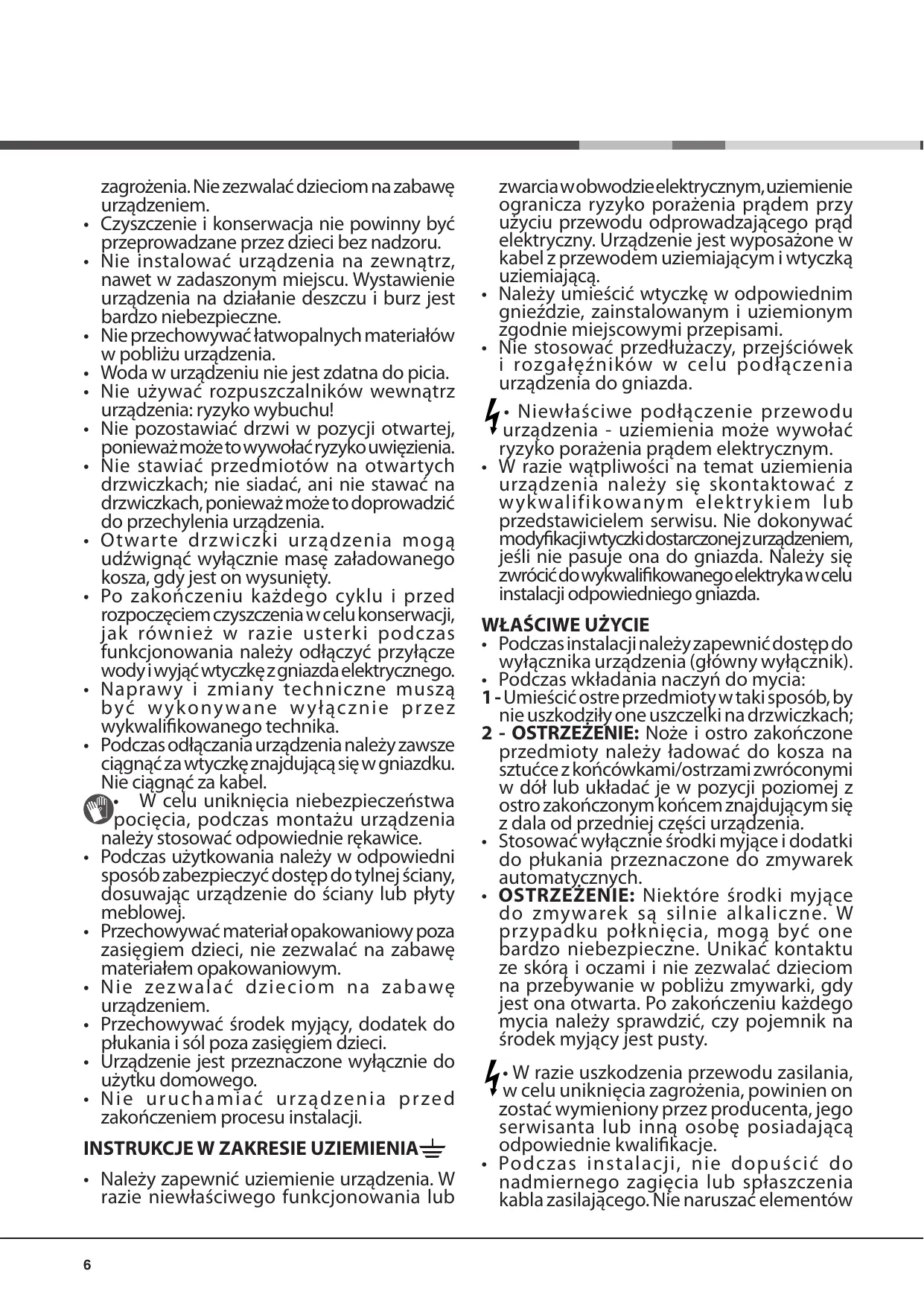 Recyclable. Les différentes parties de l’emballage ne doivent pas être dispersées dans la nature, mais mise au rebut conformément à la législation locale. • La Directive européenne 2012/19/EU relative aux déchets d’équipements électriques et électroniques (DEEE) stipule que les appareils domestiques doivent faire l’objet d’une collecte séparée de celle des déchets domestiques. Les appareils en fin de vie doivent être collectés séparément afin d’optimiser le coût de réutilisation et de recyclage des matériaux composant la machine tout en évitant les effets néfastes pour l’atmosphère et la santé publique. Le symbole représentant une poubelle sur roues barrée d’une croix rappelle aux utilisateurs leurs obligations en termes de tri sélectif. Pour plus d’informations quant à la mise au rebut correcte des appareils domestiques, les propriétaires sont invités à prendre contact avec les autorités publiques compétentes ou leur revendeur. WAŻNE WSKAZÓWKI PL BEZPIECZEŃSTWA Przed użyciem urządzenia należy przeczytać uważnie instrukcję, ponieważ zawiera ona ważne informacje na temat bezpiecznej instalacji, użytkowania i konserwacji. Zachować niniejszą instrukcję w bezpiecznym miejscu w celu przyszłej konsultacji. W przypadku sprzedaży, odstąpienia lub przeniesienia urządzenia należy się upewnić, że instrukcja została przekazana wraz z urządzeniem. Ostrożnie usunąć wszystkie materiały opakowaniowe i upewnić się, że nie zostały one uszkodzone podczas transportu. W razie uszkodzenia, skontaktować się ze sprzedawcą i nie rozpoczynać czynności montażowych. Podczas użycia zmywarki, stosować poniższe środki ostrożności: • Si ce n’est pas le cas, contacter un Service d’Assistance Technique agréé.