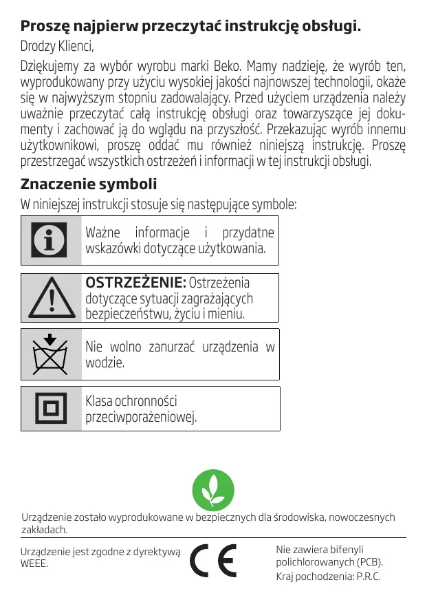 Ważne informacje i przydatne wskazówki dotyczące użytkowania. OSTRZEŻENIE: Ostrzeżenia dotyczące sytuacji zagrażających bezpieczeństwu, życiu i mieniu. Nie wolno zanurzać urządzenia w wodzie. Klasa ochronności przeciwporażeniowej. Urządzenie zostało wyprodukowane w bezpiecznych dla środowiska, nowoczesnych zakładach. Urządzenie jest zgodne z dyrektywą WEEE. Nie zawiera bifenyli polichlorowanych (PCB). Kraj pochodzenia: P.R.C.