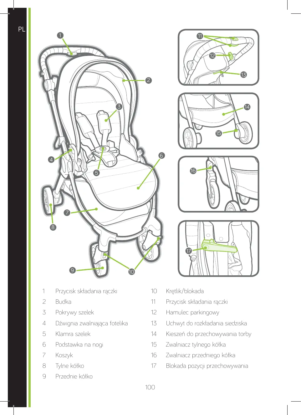 TYLNE KÓŁKA 9 Montaż • Ustaw oś tylnych kółek równo z wspornikiem kółek na ramie wózka i wsuń ją do wspornika, aż zablokuje się na miejscu. Usłyszysz kliknięcie. • Delikatnie pociągnij tylne kółko, aby sprawdzić, czy jest prawidłowo zamocowane. 10 Demontaż • Naciskając na zwalniacz kółka, delikatnie zsuń tylne kółko ze wspornika. HAMULEC 11 Blokowanie hamulców: Aby włączyć hamulec, obróć dźwignię hamulca w dół. 12 Zwalnianie hamulców: Naciśnij przycisk zwalniania hamulca. OSTRZEŻENIE: Upewnij się, że hamulec działa prawidłowo, próbując przesunąć wózek do przodu i do tyłu. Zablokuj hamulec przed wyjęciem dziecka z wózka i włożeniem go do niego oraz zawsze wtedy, gdy wózek się nie porusza. MOCOWANIE DASZKA 13 Włóż końce daszka w ramę siedziska. 14 Załóż pętlę z krótkiego sznurka na haczyk po obu stronach siedziska. 15 Z tyłu siedziska przypnij daszek. MOCOWANIE SIEDZISKA 16 Mocowanie ramy siedziska do ramy wózka: Rozłóż siedzisko i umieść je na wspornikach montażowych ramy wózka. Gdy siedzisko odpowiednio zablokowane, usłyszysz kliknięcie. • Siedzisko można również zamontować tyłem do kierunku jazdy. 17 Zdejmowanie siedziska: Unieś dźwignie zwalniające siedzisko. BUDKA 18 Pociągnij do przodu, aby otworzyć budkę, popchnij do tyłu, aby zamknąć budkę.