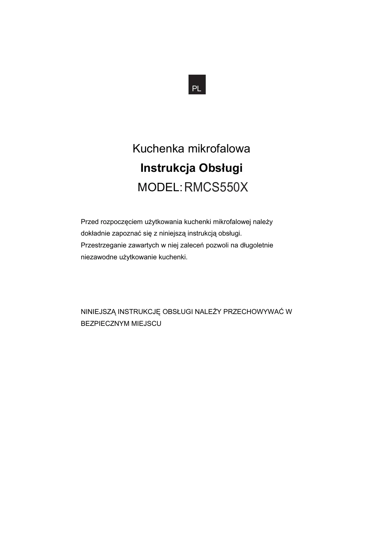 PROMIENIOWANIA MIKROFALOWEGO (a) Zabrania się dokonywania prób uruchomienia kuchenki przy drzwiach otwartych, ponieważ może to spowodować narażenie na szkodliwe promieniowanie mikrofalowe. Nie wolno wyłączać blokady zabezpieczającej, ani manipulować przy niej. (b) Nie należy umieszczać żadnych przedmiotów pomiędzy powierzchnią czołową kuchenki i drzwiami oraz nie należy dopuszczać do gromadzenia się brudu i resztek środków czyszczących na powierzchniach uszczelniających. (c) OSTRZEŻENIE: Jeżeli drzwi lub uszczelki drzwi zostaną uszkodzone, kuchenki nie wolno uruchamiać do czasu jej naprawy przez personel autoryzowanego punktu serwisowego. UWAGA Jeżeli urządzenie nie będzie utrzymywane w czystości, może dojść do uszkodzenia jego powierzchni, obniżenia trwałości oraz stworzenia zagrożenia pożarowego. Charakterystyka techniczna Model: Napięcie znamionowe: Znamionowy pobór mocy (mikrofale): Znamionowa moc wyjściowa (mikrofale): Znamionowa moc wejściowa (grill): Znamionowa moc wejściowa (Podwó jny grill): Znamionowa moc wejściowa (Mikrofale + Podwó jny grill): Znamionowa moc wyjściowa (konwekcja): Pojemność kuchenki: Średnica talerza obrotowego: Wymiary zewnętrzne Masa netto: RMCS550X 230V 50 Hz 1650 W 900 W 1750 W 2300 W 335 0 W 1750 W 44 L 360 mm 595 x 568 x 454 mm około 36 kg PL-2