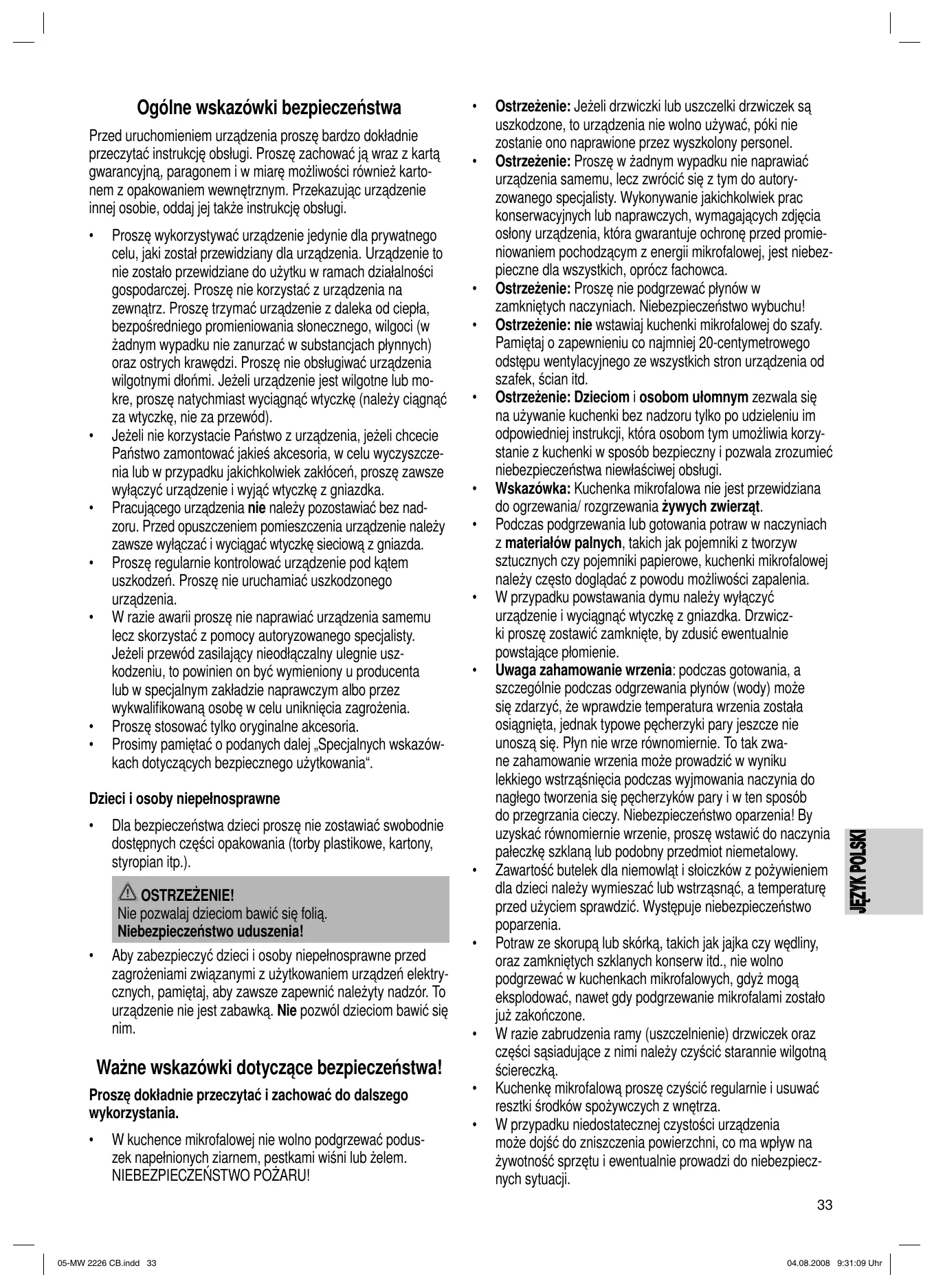 Ostrzeżenie: Jeżeli drzwiczki lub uszczelki drzwiczek są uszkodzone, to urządzenia nie wolno używać, póki nie zostanie ono naprawione przez wyszkolony personel. Ostrzeżenie: Proszę w żadnym wypadku nie naprawiać urządzenia samemu, lecz zwrócić się z tym do autoryzowanego specjalisty. Wykonywanie jakichkolwiek prac konserwacyjnych lub naprawczych, wymagających zdjęcia osłony urządzenia, która gwarantuje ochronę przed promieniowaniem pochodzącym z energii mikrofalowej, jest niebezpieczne dla wszystkich, oprócz fachowca. Ostrzeżenie: Proszę nie podgrzewać płynów w zamkniętych naczyniach. Niebezpieczeństwo wybuchu! Ostrzeżenie: nie wstawiaj kuchenki mikrofalowej do szafy. Pamiętaj o zapewnieniu co najmniej 20-centymetrowego odstępu wentylacyjnego ze wszystkich stron urządzenia od szafek, ścian itd. Ostrzeżenie: Dzieciom i osobom ułomnym zezwala się na używanie kuchenki bez nadzoru tylko po udzieleniu im odpowiedniej instrukcji, która osobom tym umożliwia korzystanie z kuchenki w sposób bezpieczny i pozwala zrozumieć niebezpieczeństwa niewłaściwej obsługi. Wskazówka: Kuchenka mikrofalowa nie jest przewidziana do ogrzewania/ rozgrzewania żywych zwierząt. Podczas podgrzewania lub gotowania potraw w naczyniach z materiałów palnych, takich jak pojemniki z tworzyw sztucznych czy pojemniki papierowe, kuchenki mikrofalowej należy często doglądać z powodu możliwości zapalenia. W przypadku powstawania dymu należy wyłączyć urządzenie i wyciągnąć wtyczkę z gniazdka. Drzwiczki proszę zostawić zamknięte, by zdusić ewentualnie powstające płomienie. Uwaga zahamowanie wrzenia: podczas gotowania, a szczególnie podczas odgrzewania płynów (wody) może się zdarzyć, że wprawdzie temperatura wrzenia została osiągnięta, jednak typowe pęcherzyki pary jeszcze nie unoszą się. Płyn nie wrze równomiernie. To tak zwane zahamowanie wrzenia może prowadzić w wyniku lekkiego wstrząśnięcia podczas wyjmowania naczynia do nagłego tworzenia się pęcherzyków pary i w ten sposób do przegrzania cieczy. Niebezpieczeństwo oparzenia! By uzyskać równomiernie wrzenie, proszę wstawić do naczynia pałeczkę szklaną lub podobny przedmiot niemetalowy. Zawartość butelek dla niemowląt i słoiczków z pożywieniem dla dzieci należy wymieszać lub wstrząsnąć, a temperaturę przed użyciem sprawdzić. Występuje niebezpieczeństwo poparzenia. Potraw ze skorupą lub skórką, takich jak jajka czy wędliny, oraz zamkniętych szklanych konserw itd., nie wolno podgrzewać w kuchenkach mikrofalowych, gdyż mogą eksplodować, nawet gdy podgrzewanie mikrofalami zostało już zakończone. W razie zabrudzenia ramy (uszczelnienie) drzwiczek oraz części sąsiadujące z nimi należy czyścić starannie wilgotną ściereczką. Kuchenkę mikrofalową proszę czyścić regularnie i usuwać resztki środków spożywczych z wnętrza. W przypadku niedostatecznej czystości urządzenia może dojść do zniszczenia powierzchni, co ma wpływ na żywotność sprzętu i ewentualnie prowadzi do niebezpiecznych sytuacji.