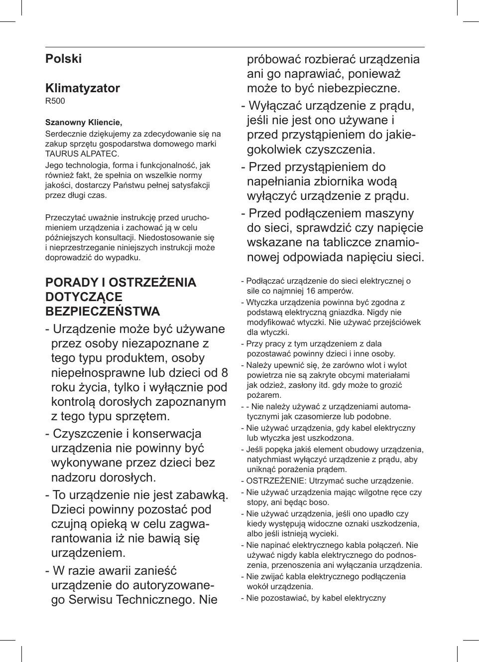 -Wtyczka urzadzenia powinna byc zgodna z podstawe elektryczna gniazdka.Nigdy nie modyfikowa ct wyczki. Nie uzywa c przysciowek dla wyczki. - Przy przy z tym urzadzeniem z dala pozostawac powinny daneci i innate osoby.