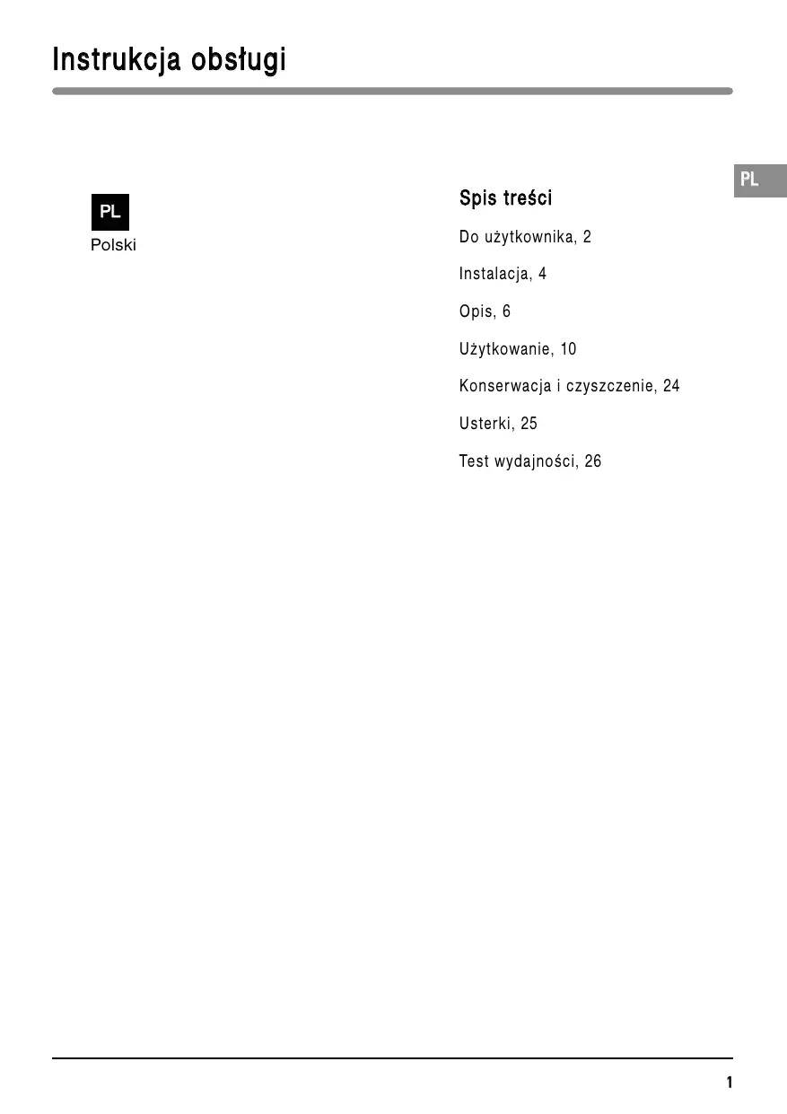 Polski Spis treści Do użytkownika, 2 Instalacja, 4 Opis, 6 Użytkowanie, 10 Konserwacja i czyszczenie, 24 Usterki, 25 Test wydajności, 26