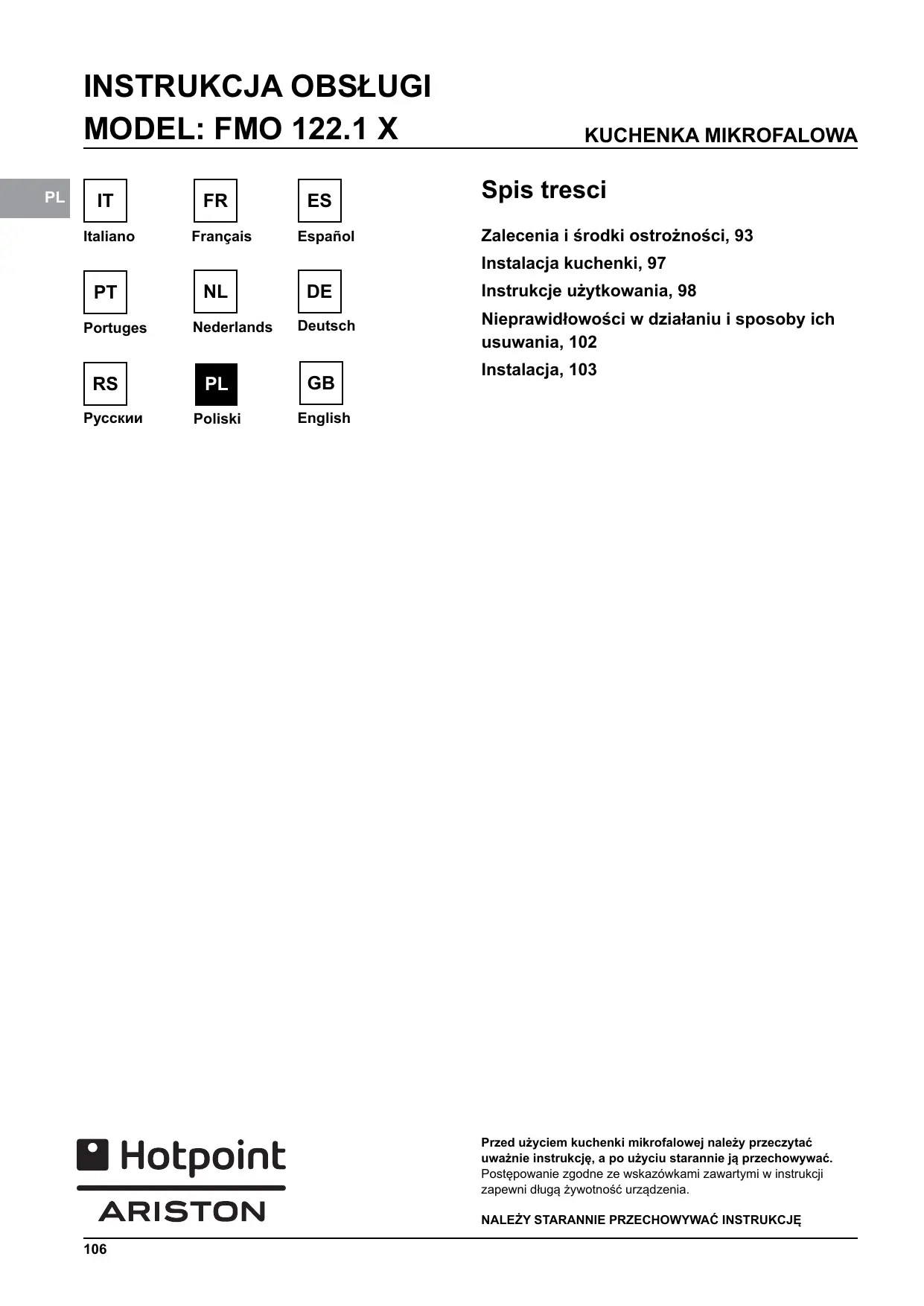 FMO1221X - Kuchenka mikrofalowa HOTPOINT - Bezpłatna instrukcja obsługi