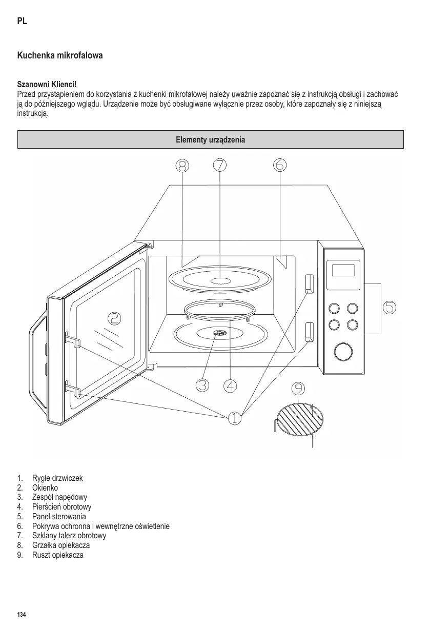 PL Kuchenka mikrofalowa Szanowni Klienci! Przed przystąpieniem do korzystania z kuchenki mikrofalowej należy uważnie zapoznać się z instrukcją obsługi i zachować ją do późniejszego wglądu. Urządzenie może być obsługiwane wyłącznie przez osoby, które zapoznały się z niniejszą instrukcją. Elementy urządzenia