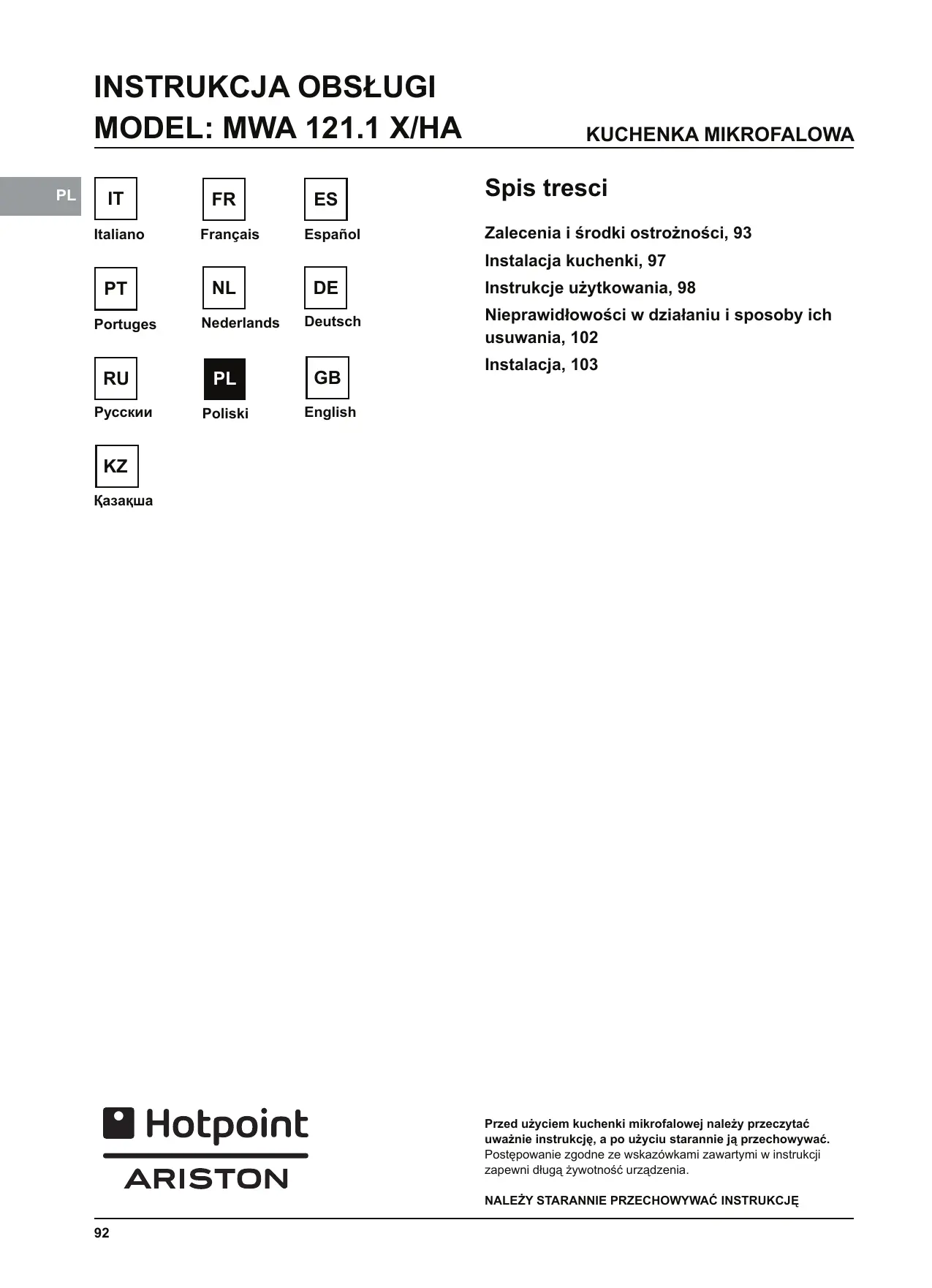 INSTRUKCJA OBSŁUGI MP796IXHA HOTPOINT