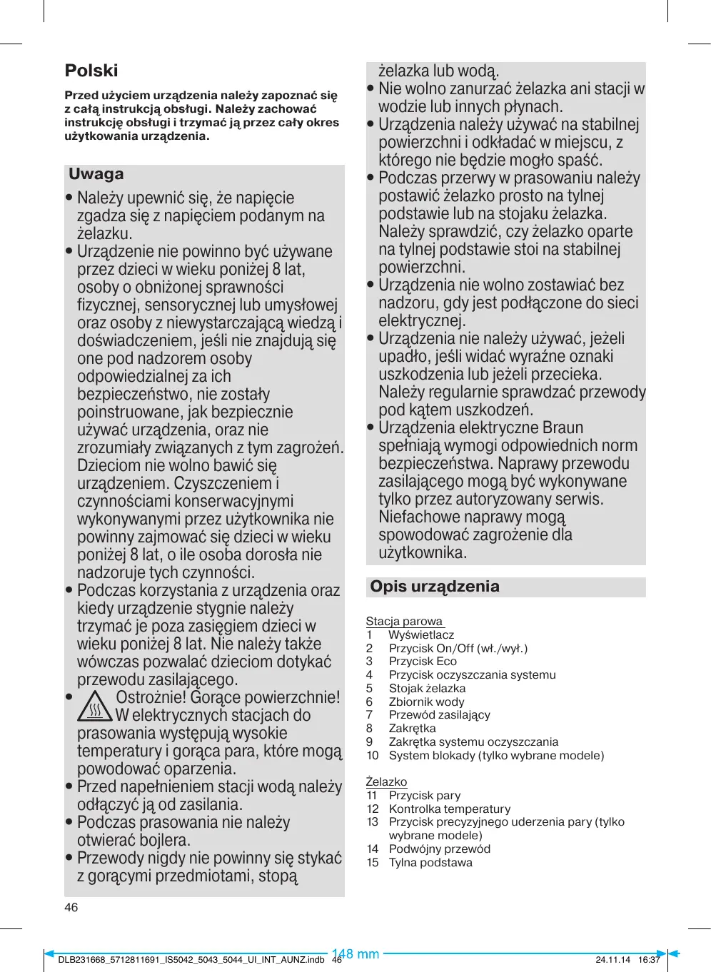 żelazka lub wodą. Nie wolno zanurzać żelazka ani stacji w wodzie lub innych płynach. Urządzenia należy używać na stabilnej powierzchni i odkładać w miejscu, z którego nie będzie mogło spaść. Podczas przerwy w prasowaniu należy postawić żelazko prosto na tylnej podstawie lub na stojaku żelazka. Należy sprawdzić, czy żelazko oparte na tylnej podstawie stoi na stabilnej powierzchni. Urządzenia nie wolno zostawiać bez nadzoru, gdy jest podłączone do sieci elektrycznej. Urządzenia nie należy używać, jeżeli upadło, jeśli widać wyraźne oznaki uszkodzenia lub jeżeli przecieka. Należy regularnie sprawdzać przewody pod kątem uszkodzeń. Urządzenia elektryczne Braun spełniają wymogi odpowiednich norm bezpieczeństwa. Naprawy przewodu zasilającego mogą być wykonywane tylko przez autoryzowany serwis. Niefachowe naprawy mogą spowodować zagrożenie dla użytkownika. Opis urządzenia Stacja parowa 1 Wyświetlacz 2 Przycisk On/Off (wł./wył.) 3 Przycisk Eco 4 Przycisk oczyszczania systemu 5 Stojak żelazka 6 Zbiornik wody 7 Przewód zasilający 8 Zakrętka 9 Zakrętka systemu oczyszczania 10 System blokady (tylko wybrane modele) Żelazko 11 Przycisk pary 12 Kontrolka temperatury 13 Przycisk precyzyjnego uderzenia pary (tylko wybrane modele) 14 Podwójny przewód 15 Tylna podstawa