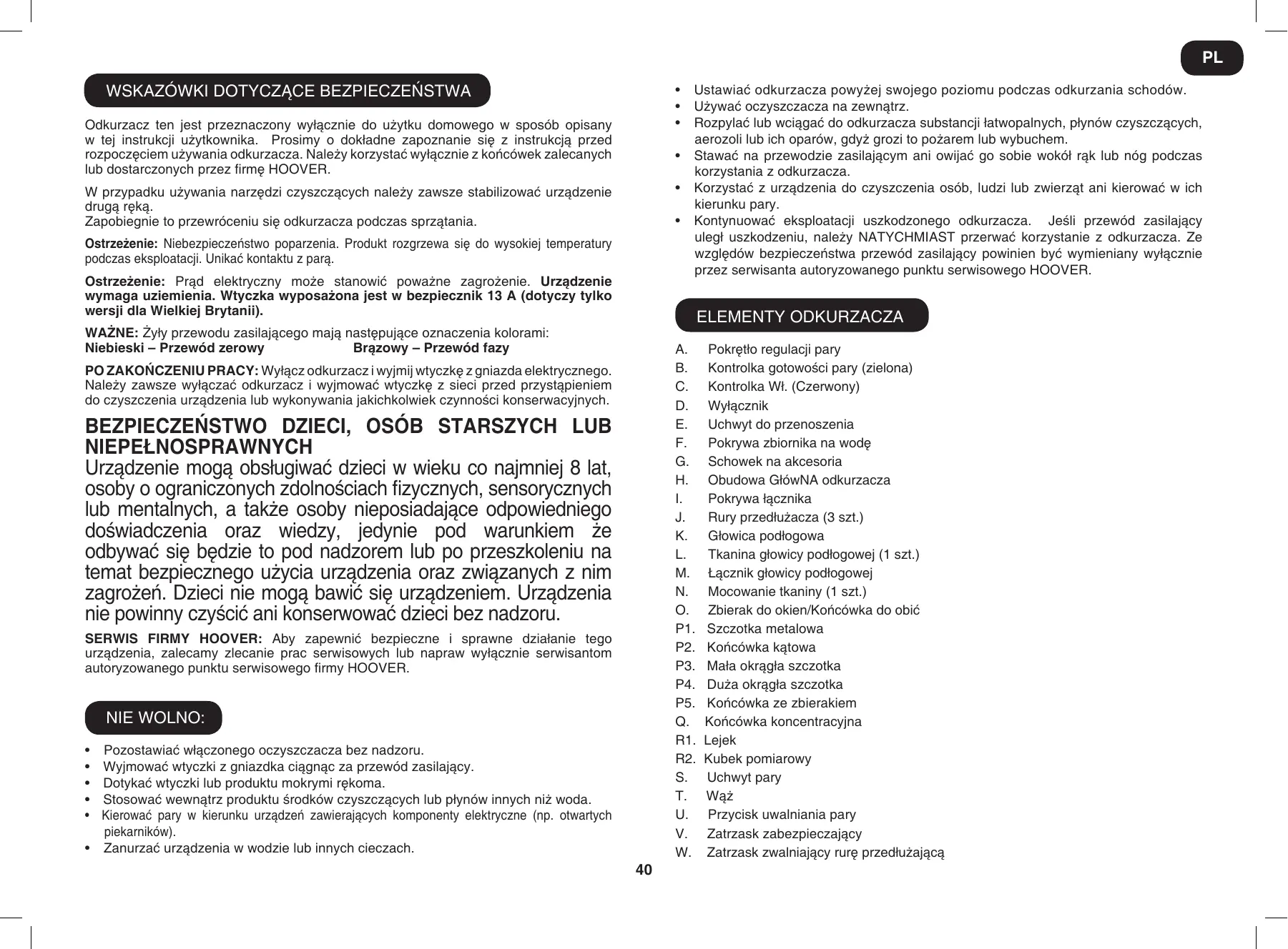 Ostrzeżenie: Niebezpieczeństwo poparzenia. Produkt rozgrzewa się do wysokiej temperatury podczas eksploatacji. Unikać kontaktu z parą. Ostrzeżenie: Prąd elektryczny może stanowić poważne zagrożenie. Urządzenie wymaga uziemienia. Wtyczka wyposażona jest w bezpiecznik 13 A (dotyczy tylko wersji dla Wielkiej Brytanii). Ustawiać odkurzacza powyżej swojego poziomu podczas odkurzania schodów. Używać oczyszczacza na zewnątrz. Rozpylać lub wciągać do odkurzacza substancji łatwopalnych, płynów czyszczących, aerozoli lub ich oparów, gdyż grozi to pożarem lub wybuchem. Stawać na przewodzie zasilającym ani owijać go sobie wokół rąk lub nóg podczas korzystania z odkurzacza. Korzystać z urządzenia do czyszczenia osób, ludzi lub zwierząt ani kierować w ich kierunku pary. Kontynuować eksploatacji uszkodzonego odkurzacza. Jeśli przewód zasilający uległ uszkodzeniu, należy NATYCHMIAST przerwać korzystanie z odkurzacza. Ze względów bezpieczeństwa przewód zasilający powinien być wymieniany wyłącznie przez serwisanta autoryzowanego punktu serwisowego HOOVER. ELEMENTY ODKURZACZA Ważne: Żyły przewodu zasilającego mają następujące oznaczenia kolorami: Niebieski – Przewód zerowy Brązowy – Przewód fazy PO ZAKOŃCZENIU PRACY: Wyłącz odkurzacz i wyjmij wtyczkę z gniazda elektrycznego. Należy zawsze wyłączać odkurzacz i wyjmować wtyczkę z sieci przed przystąpieniem do czyszczenia urządzenia lub wykonywania jakichkolwiek czynności konserwacyjnych. BEZPIECZEŃSTWO DZIECI, OSÓB STARSZYCH LUB NIEPEŁNOSPRAWNYCH Urządzenie mogą obsługiwać dzieci w wieku co najmniej 8 lat, osoby o ograniczonych zdolnościach fizycznych, sensorycznych lub mentalnych, a także osoby nieposiadające odpowiedniego doświadczenia oraz wiedzy, jedynie pod warunkiem że odbywać się będzie to pod nadzorem lub po przeszkoleniu na temat bezpiecznego użycia urządzenia oraz związanych z nim zagrożeń. Dzieci nie mogą bawić się urządzeniem. Urządzenia nie powinny czyścić ani konserwować dzieci bez nadzoru. SERWIS FIRMY HOOVER: Aby zapewnić bezpieczne i sprawne działanie tego urządzenia, zalecamy zlecanie prac serwisowych lub napraw wyłącznie serwisantom autoryzowanego punktu serwisowego firmy HOOVER. Nie wolno: