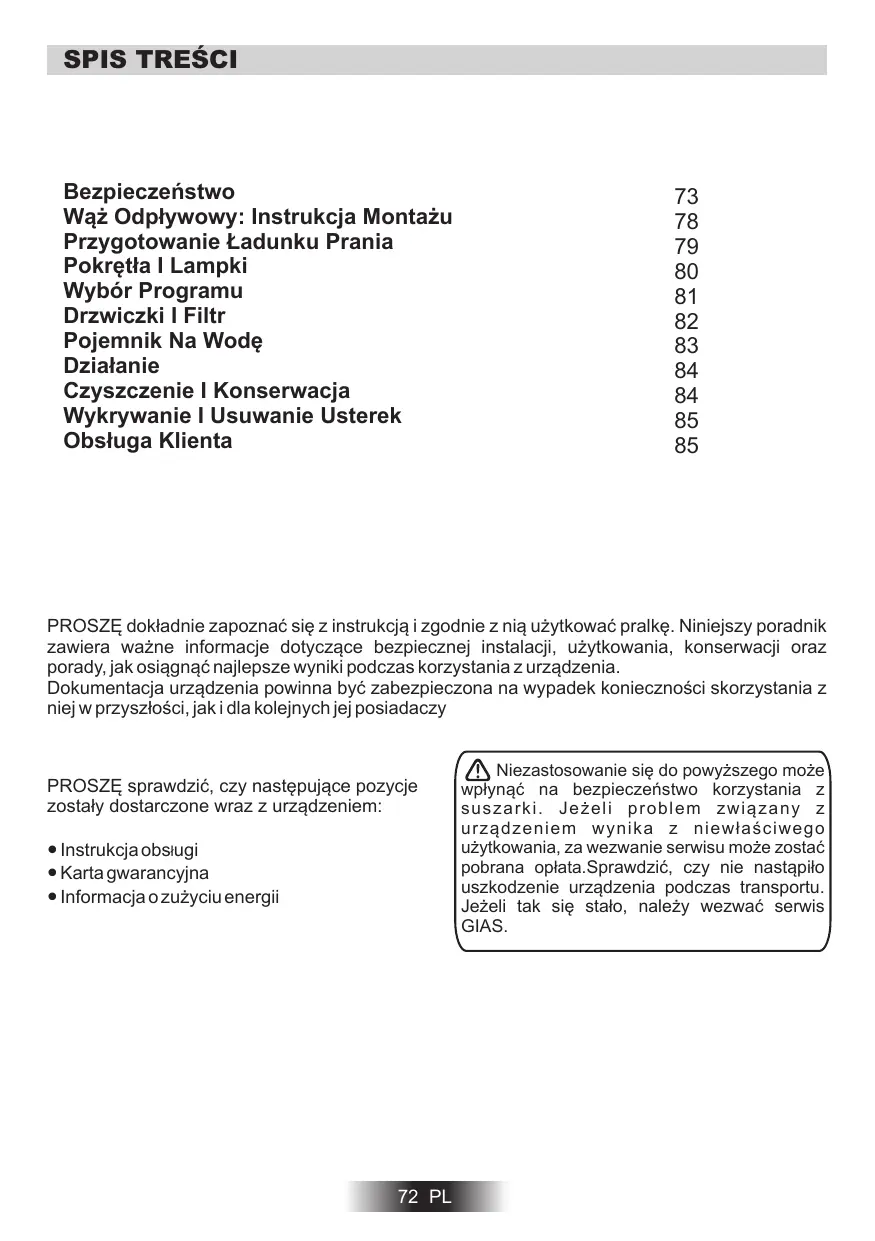 Bezpieczeństwo Wąż Odpływowy: Instrukcja Montażu Przygotowanie Ładunku Prania Pokrętła I Lampki Wybór Programu Drzwiczki I Filtr Pojemnik Na Wodę Działanie Czyszczenie I Konserwacja Wykrywanie I Usuwanie Usterek Obsługa Klienta