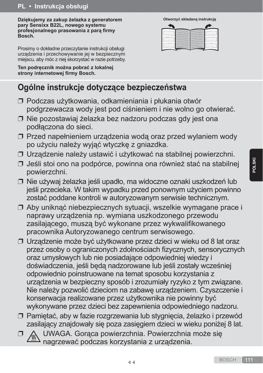 PL • Instrukcja obsługi Dziękujemy za zakup żelazka z generatorem pary Sensixx B22L, nowego systemu profesjonalnego prasowania z parą firmy Bosch.