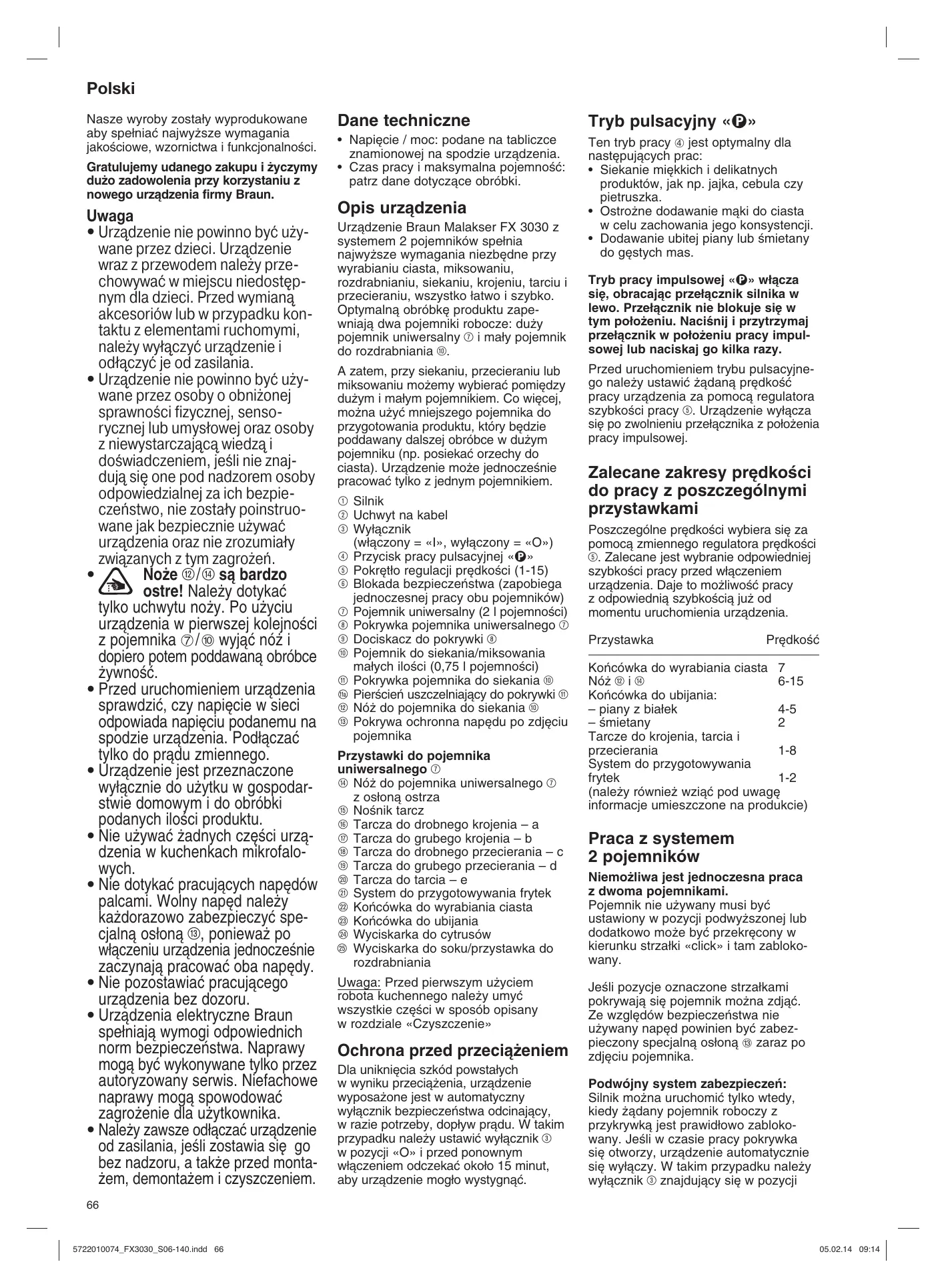 - Dodawanie ubitej piany lub Êmietany do g´stych mas. Opis urzàdzenia Urzàdzenie Braun Malakser FX 3030 z systemem 2 pojemników spe∏nia najwy˝sze wymagania niezb´dne przy wyrabianiu ciasta, miksowaniu, rozdrabnianiu, siekaniu, krojeniu, tarciu i przecieraniu, wszystko ∏atwo i szybko. Optymalnà obróbk´ produktu zapewniajà dwa pojemniki robocze: du˝y pojemnik uniwersalny 7 i ma∏y pojemnik do rozdrabniania 0. A zatem, przy siekaniu, przecieraniu lub miksowaniu mo˝emy wybieraç pomi´dzy du˝ym i ma∏ym pojemnikiem. Co wi´cej, mo˝na u˝yç mniejszego pojemnika do przygotowania produktu, który b´dzie poddawany dalszej obróbce w du˝ym pojemniku (np. posiekaç orzechy do ciasta). Urzàdzenie mo˝e jednoczeÊnie pracowaç tylko z jednym pojemnikiem. 1 Silnik 2 Uchwyt na kabel 3 Wy∏àcznik (w∏àczony = «I», wy∏àczony = «O») 4 Przycisk pracy pulsacyjnej «» 5 Pokr´t∏o regulacji pr´dkoÊci (1-15) 6 Blokada bezpieczeƒstwa (zapobiega jednoczesnej pracy obu pojemników) 7 Pojemnik uniwersalny (2 l pojemnoÊci) 8 Pokrywka pojemnika uniwersalnego 7 9 Dociskacz do pokrywki 8 0 Pojemnik do siekania/miksowania ma∏ych iloÊci (0,75 l pojemnoÊci) q Pokrywka pojemnika do siekania 0 11a PierÊcieƒ uszczelniajàcy do pokrywki q w Nó˝ do pojemnika do siekania 0 e Pokrywa ochronna nap´du po zdj´ciu pojemnika Przystawki do pojemnika uniwersalnego 7 r Nó˝ do pojemnika uniwersalnego 7 z os∏onà ostrza t NoÊnik tarcz z Tarcza do drobnego krojenia – a u Tarcza do grubego krojenia – b i Tarcza do drobnego przecierania – c o Tarcza do grubego przecierania – d p Tarcza do tarcia – e a System do przygotowywania frytek s Koƒcówka do wyrabiania ciasta d Koƒcówka do ubijania f Wyciskarka do cytrusów g Wyciskarka do soku/przystawka do rozdrabniania Uwaga: Przed pierwszym u˝yciem robota kuchennego nale˝y umyç wszystkie cz´Êci w sposób opisany w rozdziale «Czyszczenie» Tryb pracy impulsowej «» włącza się, obracając przełącznik silnika w lewo. Przełącznik nie blokuje się w tym położeniu. Naciśnij i przytrzymaj przełącznik w położeniu pracy impulsowej lub naciskaj go kilka razy. Przed uruchomieniem trybu pulsacyjnego nale˝y ustawiç ˝àdanà pr´dkoÊç pracy urzàdzenia za pomocà regulatora szybkoÊci pracy 5. Urządzenie wyłącza się po zwolnieniu przełącznika z położenia pracy impulsowej. Zalecane zakresy pr´dkoÊci do pracy z poszczególnymi przystawkami Poszczególne pr´dkoÊci wybiera si´ za pomocà zmiennego regulatora pr´dkoÊci