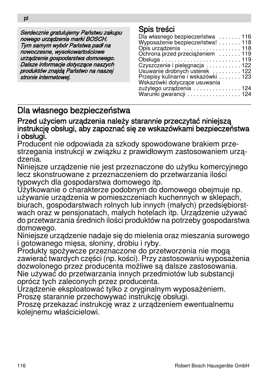 - Warunki gwarancji Dla własnego bezpieczeństwa Przed użyciem urządzenia należy starannie przeczytać niniejszą instrukcję obsługi, aby zapoznać się ze wskazówkami bezpieczeństwa i obsługi. Producent nie odpowiada za szkody spowodowane brakiem przestrzegania instrukcji w związku z prawidłowym zastosowaniem urządzenia. Niniejsze urządzenie nie jest przeznaczone do użytku komercyjnego lecz skonstruowane z przeznaczeniem do przetwarzania ilości typowych dla gospodarstwa domowego itp. Użytkowanie o charakterze podobnym do domowego obejmuje np. używanie urządzenia w pomieszczeniach kuchennych w sklepach, biurach, gospodarstwach rolnych lub innych (małych) przedsiębiorstwach oraz w pensjonatach, małych hotelach itp. Urządzenie używać do przetwarzania średnich ilości produktów na potrzeby gospodarstwa domowego. Niniejsze urządzenie nadaje się do mielenia oraz mieszania surowego i gotowanego mięsa, słoniny, drobiu i ryby. Produkty spożywcze przeznaczone do przetworzenia nie mogą zawierać twardych części (np. kości). Przy zastosowaniu wyposażenia dozwolonego przez producenta możliwe są dalsze zastosowania. Nie używać do przetwarzania innych przedmiotów lub substancji oprócz tych zaleconych przez producenta. Urządzenie eksploatować tylko z oryginalnym wyposażeniem. Proszę starannie przechowywać instrukcję obsługi. Proszę przekazać instrukcję wraz z urządzeniem ewentualnemu kolejnemu właścicielowi. p. 124
