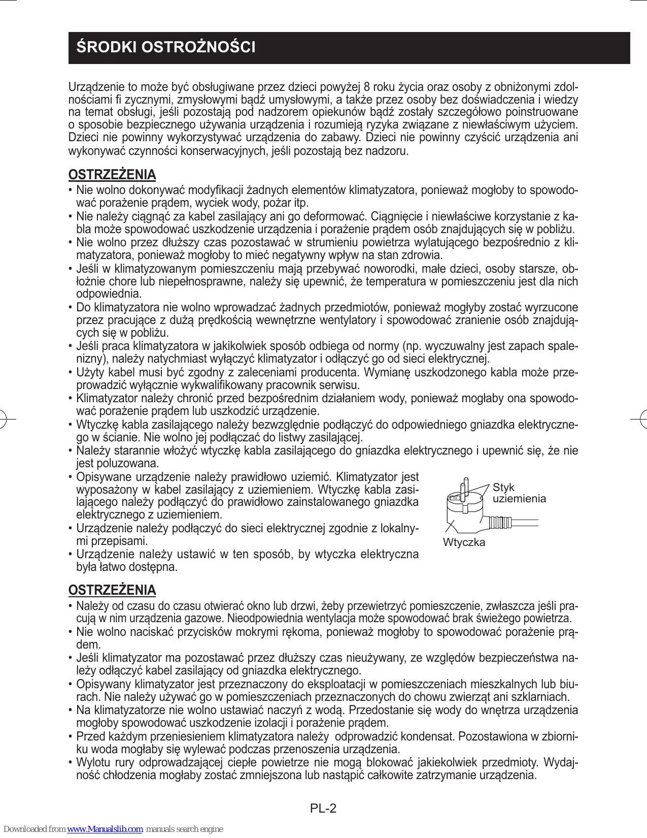 • Należy od czasu do czasu otwierać okno lub drzwi, żeby przewietrzyć pomieszczenie, zwłaszcza jeśli pracują w nim urządzenia gazowe. Nieodpowiednia wentylacja może spowodować brak świeżego powietrza. • Nie wolno naciskać przycisków mokrymi rękoma, ponieważ mogłoby to spowodować porażenie prądem. • Jeśli klimatyzator ma pozostawać przez dłuższy czas nieużywany, ze względów bezpieczeństwa należy odłączyć kabel zasilający od gniazdka elektrycznego. • Opisywany klimatyzator jest przeznaczony do eksploatacji w pomieszczeniach mieszkalnych lub biurach. Nie należy używać go w pomieszczeniach przeznaczonych do chowu zwierząt ani szklarniach. • Na klimatyzatorze nie wolno ustawiać naczyń z wodą. Przedostanie się wody do wnętrza urządzenia mogłoby spowodować uszkodzenie izolacji i porażenie prądem. • Przed każdym przeniesieniem klimatyzatora należy odprowadzić kondensat. Pozostawiona w zbiorniku woda mogłaby się wylewać podczas przenoszenia urządzenia. • Wylotu rury odprowadzającej ciepłe powietrze nie mogą blokować jakiekolwiek przedmioty. Wydajność chłodzenia mogłaby zostać zmniejszona lub nastąpić całkowite zatrzymanie urządzenia. PL-2 Downloaded from www.Manualslib.com manuals search engine