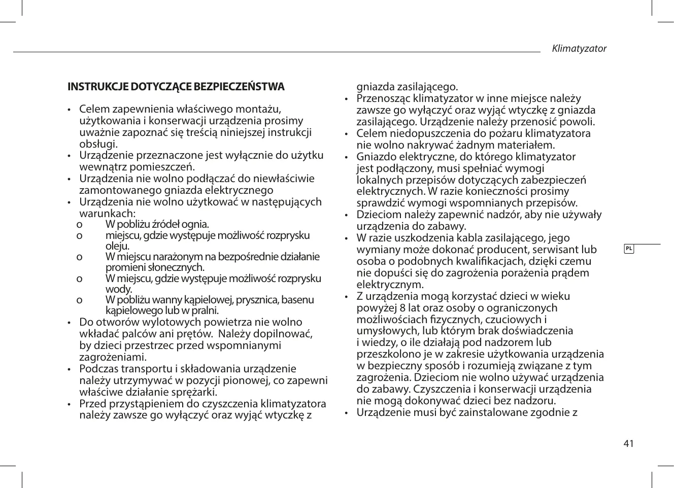 - Celem niedopuszczenia do pożaru klimatyzatora nie wolno nakrywać żadnym materiałem.