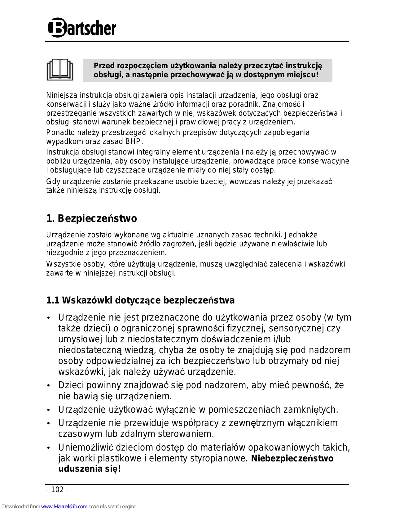 Urządzenie nie jest przeznaczone do użytkowania przez osoby (w tym także dzieci) o ograniczonej sprawności fizycznej, sensorycznej czy umysłowej lub z niedostatecznym doświadczeniem i/lub niedostateczną wiedzą, chyba że osoby te znajdują się pod nadzorem osoby odpowiedzialnej za ich bezpieczeństwo lub otrzymały od niej wskazówki, jak należy używać urządzenie. Dzieci powinny znajdować się pod nadzorem, aby mieć pewność, że nie bawią się urządzeniem. Urządzenie użytkować wyłącznie w pomieszczeniach zamkniętych. Urządzenie nie przewiduje współpracy z zewnętrznym włącznikiem czasowym lub zdalnym sterowaniem. Uniemożliwić dzieciom dostęp do materiałów opakowaniowych takich, jak worki plastikowe i elementy styropianowe. Niebezpieczeństwo uduszenia się! - 102 Downloaded from www.Manualslib.com manuals search engine