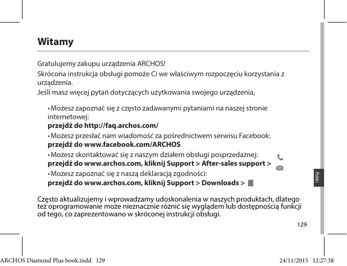• Puede consultar las preguntas más frecuentes en nuestro sitio web: entre en http://faq.archos.com/ • Puede enviarnos un mensaje en Facebook: entre en www.facebook.com/ARCHOS • Puede contactarnos a través de nuestro departamento de posventa: entre en www.archos.com, haga clic en Support (Asistencia) > After-sales support (Asistencia posventa) > • Puede consultar la declaración de conformidad: entre en www.archos.com, haga clic en Support (Asistencia) > Downloads (Descargas) > Al estar actualizando y mejorando constantemente nuestros productos, la apariencia o el software de su dispositivo pueden variar ligeramente con respecto a lo descrito en esta Guía Rápida de Inicio.