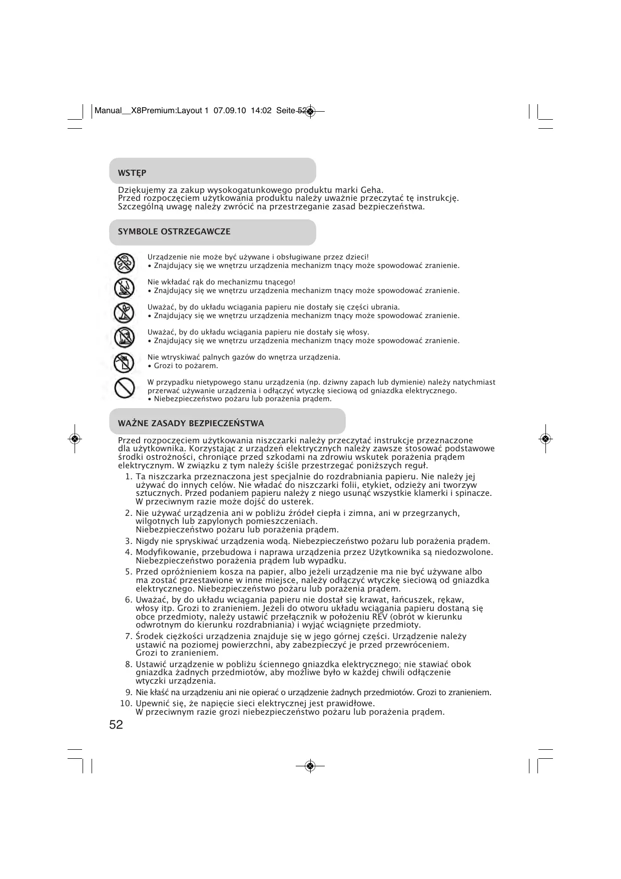 Manual__X8Premium:Layout 1 07.09.10 14:02 Seite 52 WSTĘP Dziękujemy za zakup wysokogatunkowego produktu marki Geha. Przed rozpoczęciem użytkowania produktu należy uważnie przeczytać tę instrukcję. Szczególną uwagę należy zwrócić na przestrzeganie zasad bezpieczeństwa. SYMBOLE OSTRZEGAWCZE Urządzenie nie może być używane i obsługiwane przez dzieci!