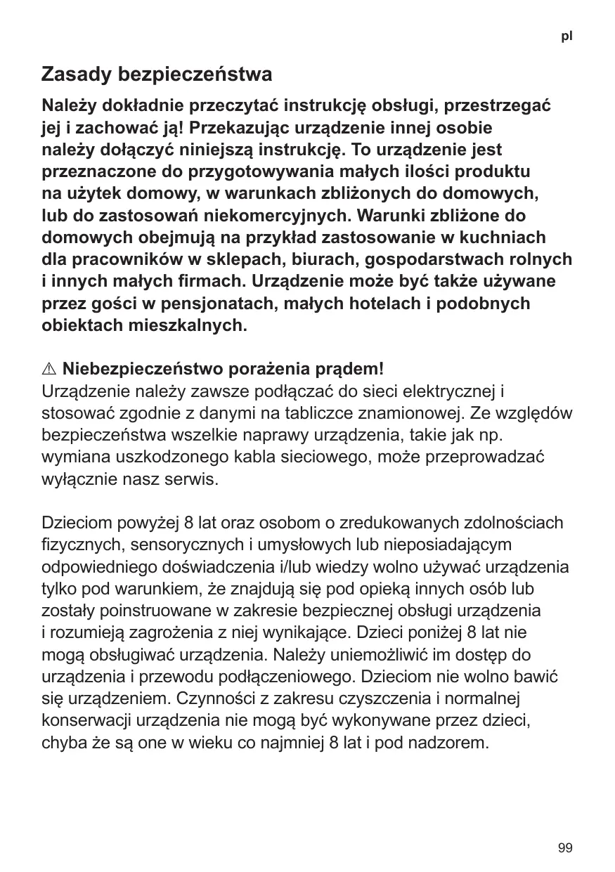 Zasady bezpieczeństwa Należy dokładnie przeczytać instrukcję obsługi, przestrzegać jej i zachować ją! Przekazując urządzenie innej osobie należy dołączyć niniejszą instrukcję. To urządzenie jest przeznaczone do przygotowywania małych ilości produktu na użytek domowy, w warunkach zbliżonych do domowych, lub do zastosowań niekomercyjnych. Warunki zbliżone do domowych obejmują na przykład zastosowanie w kuchniach dla pracowników w sklepach, biurach, gospodarstwach rolnych i innych małych firmach. Urządzenie może być także używane przez gości w pensjonatach, małych hotelach i podobnych obiektach mieszkalnych. ¡ Niebezpieczeństwo porażenia prądem! Urządzenie należy zawsze podłączać do sieci elektrycznej i stosować zgodnie z danymi na tabliczce znamionowej. Ze względów bezpieczeństwa wszelkie naprawy urządzenia, takie jak np. wymiana uszkodzonego kabla sieciowego, może przeprowadzać wyłącznie nasz serwis. Dzieciom powyżej 8 lat oraz osobom o zredukowanych zdolnościach fizycznych, sensorycznych i umysłowych lub nieposiadającym odpowiedniego doświadczenia i/lub wiedzy wolno używać urządzenia tylko pod warunkiem, że znajdują się pod opieką innych osób lub zostały poinstruowane w zakresie bezpiecznej obsługi urządzenia i rozumieją zagrożenia z niej wynikające. Dzieci poniżej 8 lat nie mogą obsługiwać urządzenia. Należy uniemożliwić im dostęp do urządzenia i przewodu podłączeniowego. Dzieciom nie wolno bawić się urządzeniem. Czynności z zakresu czyszczenia i normalnej konserwacji urządzenia nie mogą być wykonywane przez dzieci, chyba że są one w wieku co najmniej 8 lat i pod nadzorem.