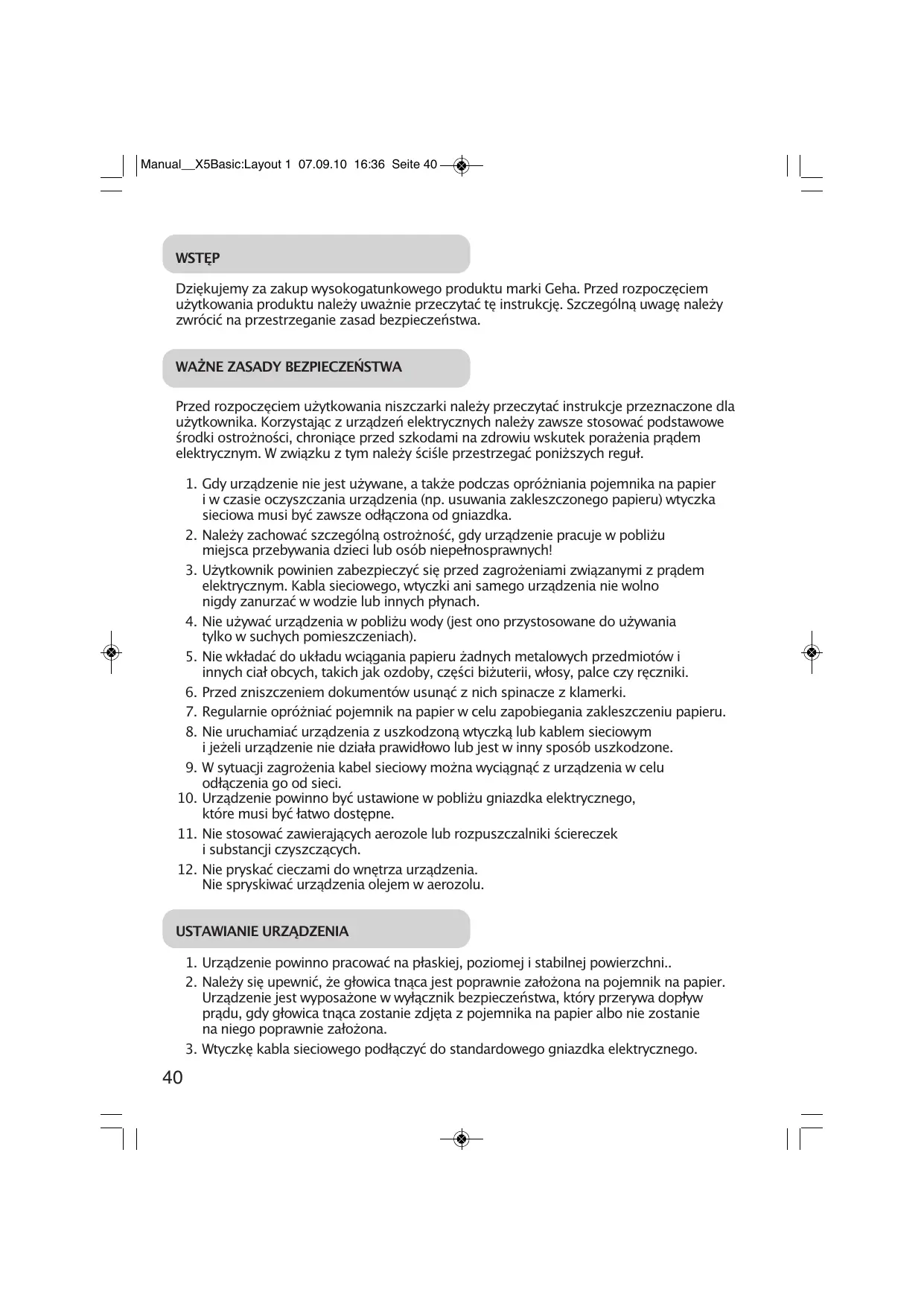 Manual__X5Basic:Layout 1 07.09.10 16:36 Seite 40 WSTĘP Dziękujemy za zakup wysokogatunkowego produktu marki Geha. Przed rozpoczęciem użytkowania produktu należy uważnie przeczytać tę instrukcję. Szczególną uwagę należy zwrócić na przestrzeganie zasad bezpieczeństwa.
