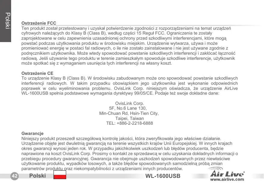 Polski Ostrzeżenie FCC Ten produkt został przetestowany i uzyskał potwierdzenie zgodności z rozporządzeniami na temat urządzeń cyfrowych należących do Klasy B (Class B), według części 15 Reguł FCC. Ograniczenia te zostały zaprojektowane w celu zapewnienia uzasadnionej ochrony przed szkodliwymi interferencjami, które mogą powstać podczas użytkowania produktu w środowisku miejskim. Urządzenie wytwarza, używa i może promieniować energię w postaci fal radiowych, o ile nie zostało zainstalowane i nie jest używane zgodnie z podręcznikiem użytkownika. Może wtedy spowodować powstanie szkodliwych interferencji i zakłócać łączność radiową. Jeśli używanie tego produktu w terenie zamieszkałym spowoduje szkodliwe interferencje, użytkownik może spotkać się z wymaganiem usunięcia tych interferencji na własny koszt. Ostrzeżenie CE To urządzenie Klasy B (Class B). W środowisku zabudowanym może ono spowodować powstanie szkodliwych interferencji radiowych. W takim przypadku obowiązkiem jego użytkownika jest wykonanie odpowiednich poprawek w celu wyeliminowania problemu. OvisLink Corp. niniejszym oświadcza, że urządzenie AirLive WL-1600USB spełnia podstawowe wymagania dyrektywy 99/05/CE. Podaje też swoje dokładne dane: OvisLink Corp. 5F, No.6 Lane 130, Min-Chuan Rd, Hsin-Tien City, Taipei, Taiwan