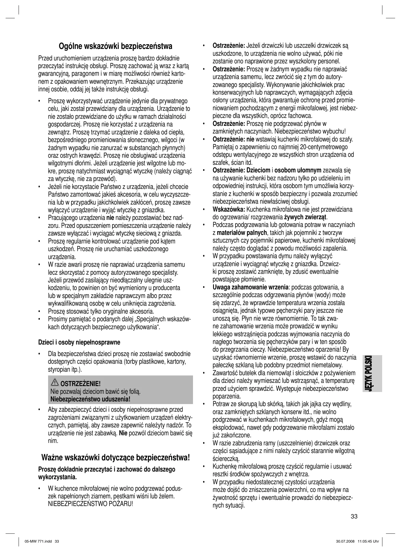 Ostrzeżenie: Jeżeli drzwiczki lub uszczelki drzwiczek są uszkodzone, to urządzenia nie wolno używać, póki nie zostanie ono naprawione przez wyszkolony personel. Ostrzeżenie: Proszę w żadnym wypadku nie naprawiać urządzenia samemu, lecz zwrócić się z tym do autoryzowanego specjalisty. Wykonywanie jakichkolwiek prac konserwacyjnych lub naprawczych, wymagających zdjęcia osłony urządzenia, która gwarantuje ochronę przed promieniowaniem pochodzącym z energii mikrofalowej, jest niebezpieczne dla wszystkich, oprócz fachowca. Ostrzeżenie: Proszę nie podgrzewać płynów w zamkniętych naczyniach. Niebezpieczeństwo wybuchu! Ostrzeżenie: nie wstawiaj kuchenki mikrofalowej do szafy. Pamiętaj o zapewnieniu co najmniej 20-centymetrowego odstępu wentylacyjnego ze wszystkich stron urządzenia od szafek, ścian itd. Ostrzeżenie: Dzieciom i osobom ułomnym zezwala się na używanie kuchenki bez nadzoru tylko po udzieleniu im odpowiedniej instrukcji, która osobom tym umożliwia korzystanie z kuchenki w sposób bezpieczny i pozwala zrozumieć niebezpieczeństwa niewłaściwej obsługi. Wskazówka: Kuchenka mikrofalowa nie jest przewidziana do ogrzewania/ rozgrzewania żywych zwierząt. Podczas podgrzewania lub gotowania potraw w naczyniach z materiałów palnych, takich jak pojemniki z tworzyw sztucznych czy pojemniki papierowe, kuchenki mikrofalowej należy często doglądać z powodu możliwości zapalenia. W przypadku powstawania dymu należy wyłączyć urządzenie i wyciągnąć wtyczkę z gniazdka. Drzwiczki proszę zostawić zamknięte, by zdusić ewentualnie powstające płomienie. Uwaga zahamowanie wrzenia: podczas gotowania, a szczególnie podczas odgrzewania płynów (wody) może się zdarzyć, że wprawdzie temperatura wrzenia została osiągnięta, jednak typowe pęcherzyki pary jeszcze nie unoszą się. Płyn nie wrze równomiernie. To tak zwane zahamowanie wrzenia może prowadzić w wyniku lekkiego wstrząśnięcia podczas wyjmowania naczynia do nagłego tworzenia się pęcherzyków pary i w ten sposób do przegrzania cieczy. Niebezpieczeństwo oparzenia! By uzyskać równomiernie wrzenie, proszę wstawić do naczynia pałeczkę szklaną lub podobny przedmiot niemetalowy. Zawartość butelek dla niemowląt i słoiczków z pożywieniem dla dzieci należy wymieszać lub wstrząsnąć, a temperaturę przed użyciem sprawdzić. Występuje niebezpieczeństwo poparzenia. Potraw ze skorupą lub skórką, takich jak jajka czy wędliny, oraz zamkniętych szklanych konserw itd., nie wolno podgrzewać w kuchenkach mikrofalowych, gdyż mogą eksplodować, nawet gdy podgrzewanie mikrofalami zostało już zakończone. W razie zabrudzenia ramy (uszczelnienie) drzwiczek oraz części sąsiadujące z nimi należy czyścić starannie wilgotną ściereczką. Kuchenkę mikrofalową proszę czyścić regularnie i usuwać resztki środków spożywczych z wnętrza. W przypadku niedostatecznej czystości urządzenia może dojść do zniszczenia powierzchni, co ma wpływ na żywotność sprzętu i ewentualnie prowadzi do niebezpiecznych sytuacji.