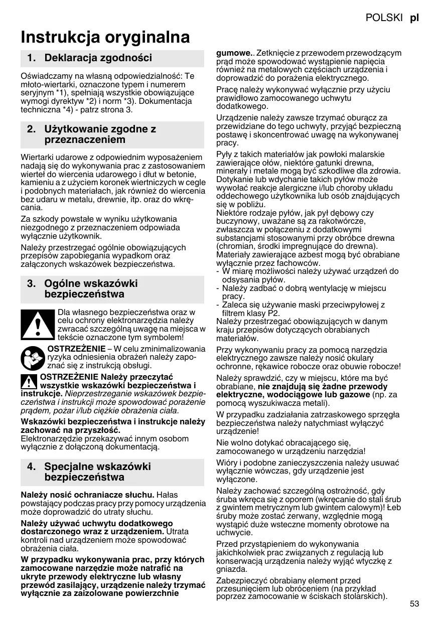 2. Utilisation conforme à la destination Equipé des accessoires correspondants, ces perceuses à percussion sont prévues pour travailler avec des forets marteau et des burins dans le béton, la pierre ou des matériaux similaires, et avec des trépans dans les tuiles, etc., ainsi que pour percer sans percussion dans le métal, le bois, etc. ou pour serrer des vis. L'utilisateur sera entièrement responsable de tous dommages résultant d'une utilisation non conforme à la destination de l'appareil. Il est impératif de respecter les consignes générales de protection contre les accidents ainsi que les consignes de sécurité ci-jointes.