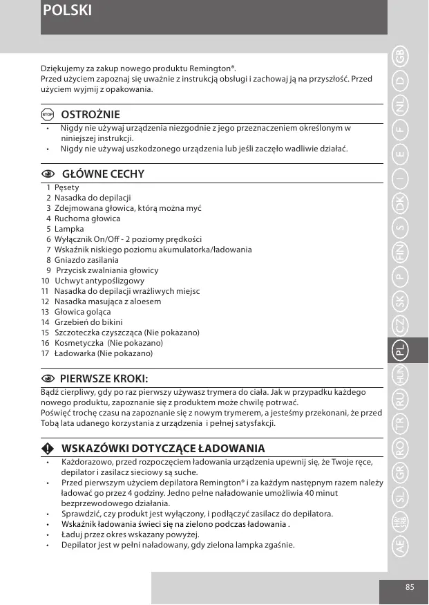 POLSKI Dziękujemy za zakup nowego produktu Remington®. Przed użyciem zapoznaj się uważnie z instrukcją obsługi i zachowaj ją na przyszłość. Przed użyciem wyjmij z opakowania.