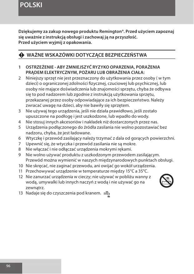 POLSKI Dziękujemy za zakup nowego produktu Remington®. Przed użyciem zapoznaj się uważnie z instrukcją obsługi i zachowaj ją na przyszłość. Przed użyciem wyjmij z opakowania. F WAŻNE WSKAZÓWKI DOTYCZĄCE BEZPIECZEŃSTWA