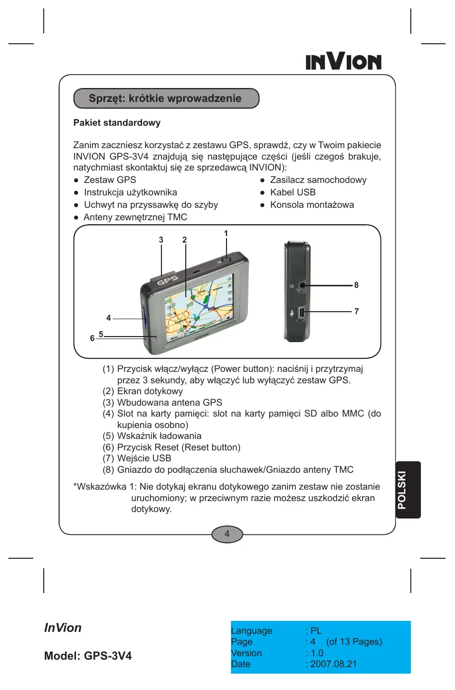 InVion Model: GPS-3V4 Language Page Version Date : PL : (of 13 Pages) : 1.0 : 2007.08.21 Sprzęt: krótkie wprowadzenie Pakiet standardowy Zanim zaczniesz korzystać z zestawu GPS, sprawdź, czy w Twoim pakiecie INVION GPS-3V4 znajdują się następujące części (jeśli czegoś brakuje, natychmiast skontaktuj się ze sprzedawcą INVION): ● Zestaw GPS ● Zasilacz samochodowy ● Instrukcja użytkownika ● Kabel USB ● Uchwyt na przyssawkę do szyby ● Konsola montażowa ● Anteny zewnętrznej TMC
