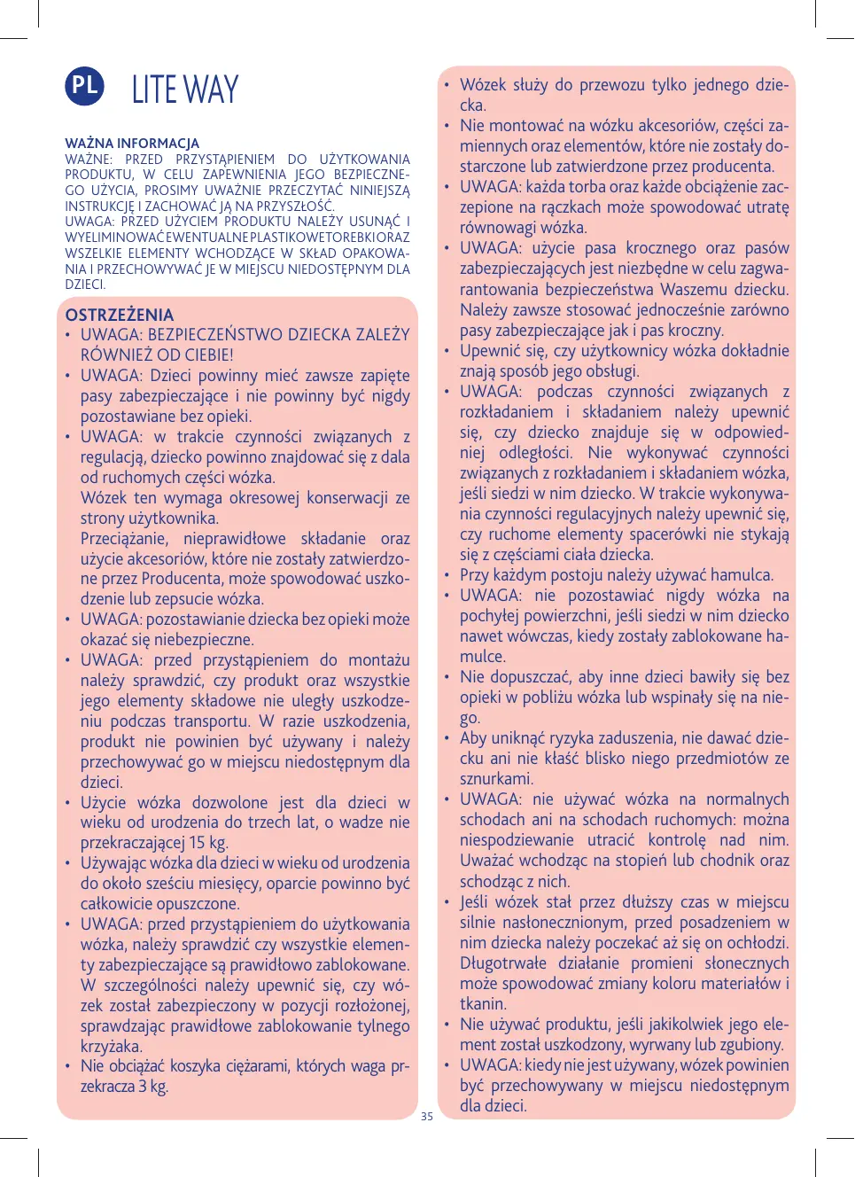 • AVERTISSEMENT: pendant l’ouverture ou la fermeture de la poussette, s’assurer que l’enfant se trouve à bonne distance : ne pas fermer et ouvrir la poussette avec l’enfant dedans. Pendant les manipulations, s’assurer que les parties mobiles de la poussette n’entrent pas en contact avec le corps de l’enfant. • Utiliser le système de freinage à chaque arrêt. • AVERTISSEMENT: ne jamais laisser la poussette sur un plan incliné avec l’enfant dedans, même avec les freins serrés. • Ne pas laisser d’autres enfants jouer sans surveillance près de la poussette ou grimper dessus. • Pour éviter tout risque d’étranglement ne pas placer près de l’enfant ou lui donner d’objets munis de cordes. • AVERTISSEMENT: ne pas utiliser la poussette sur les escaliers ou sur les escalators : il est possible d’en perdre le contrôle à tout moment. Faire attention, lorsque vous montez ou descendez une marche ou un trottoir. • En cas d’exposition prolongée au soleil, attendre que la poussette refroidisse avant d’y mettre l’enfant. Une exposition prolongée au soleil peut provoquer des variations de couleurs des matériaux et des tissus. • Ne pas utiliser le produit si des parties sont cassées, arrachées ou manquantes. • AVERTISSEMENT: lorsque la poussette n’est pas utilisée, la ranger hors de portée des enfants. • AVERTISSEMENT: ce produit n’est pas conçu pour courir ou pour patiner. • Éviter tout contact de la poussette avec de l’eau salée pour empêcher la formation de rouille. • Ne pas utiliser la poussette sur la plage. • AVERTISSEMENT: ce produit doit être utilisé uniquement par un adulte.