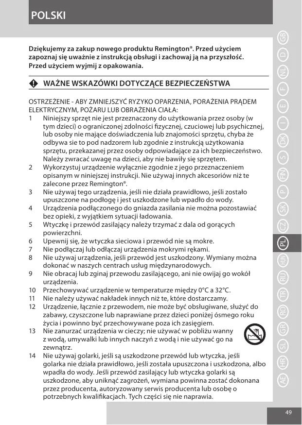 OSTRZEŻENIE - ABY ZMNIEJSZYĆ RYZYKO OPARZENIA, PORAŻENIA PRĄDEM ELEKTRYCZNYM, POŻARU LUB OBRAŻENIA CIAŁA: Niniejszy sprzęt nie jest przeznaczony do użytkowania przez osoby (w tym dzieci) o ograniczonej zdolności fizycznej, czuciowej lub psychicznej, lub osoby nie mające doświadczenia lub znajomości sprzętu, chyba że odbywa sie to pod nadzorem lub zgodnie z instrukcją użytkowania sprzętu, przekazanej przez osoby odpowiadające za ich bezpieczeństwo. Należy zwracać uwagę na dzieci, aby nie bawiły się sprzętem. Wykorzystuj urządzenie wyłącznie zgodnie z jego przeznaczeniem opisanym w niniejszej instrukcji. Nie używaj innych akcesoriów niż te zalecone przez Remington®. Nie używaj tego urządzenia, jeśli nie działa prawidłowo, jeśli zostało upuszczone na podłogę i jest uszkodzone lub wpadło do wody. Urządzenia podłączonego do gniazda zasilania nie można pozostawiać bez opieki, z wyjątkiem sytuacji ładowania. Wtyczkę i przewód zasilający należy trzymać z dala od gorących powierzchni. Upewnij się, że wtyczka sieciowa i przewód nie są mokre. Nie podłączaj lub odłączaj urządzenia mokrymi rękami. Nie używaj urządzenia, jeśli przewód jest uszkodzony. Wymiany można dokonać w naszych centrach usług międzynarodowych. Nie obracaj lub zginaj przewodu zasilającego, ani nie owijaj go wokół urządzenia. 10 Przechowywać urządzenie w temperaturze między 0°C a 32°C. 11 Nie należy używać nakładek innych niż te, które dostarczamy. 12 Urządzenie, łącznie z przewodem, nie może być obsługiwane, służyć do zabawy, czyszczone lub naprawiane przez dzieci poniżej ósmego roku życia i powinno być przechowywane poza ich zasięgiem. 13 Nie zanurzać urządzenia w cieczy; nie używać w pobliżu wanny z wodą, umywalki lub innych naczyń z wodą i nie używać go na zewnątrz. 14 Nie używaj golarki, jeśli są uszkodzone przewód lub wtyczka, jeśli golarka nie działa prawidłowo, jeśli została upuszczona i uszkodzona, albo wpadła do wody. Jeśli przewód zasilający lub wtyczka golarki są uszkodzone, aby uniknąć zagrożeń, wymiana powinna zostać dokonana przez producenta, autoryzowany serwis producenta lub osobę o potrzebnych kwalifikacjach. Tych części się nie naprawia.