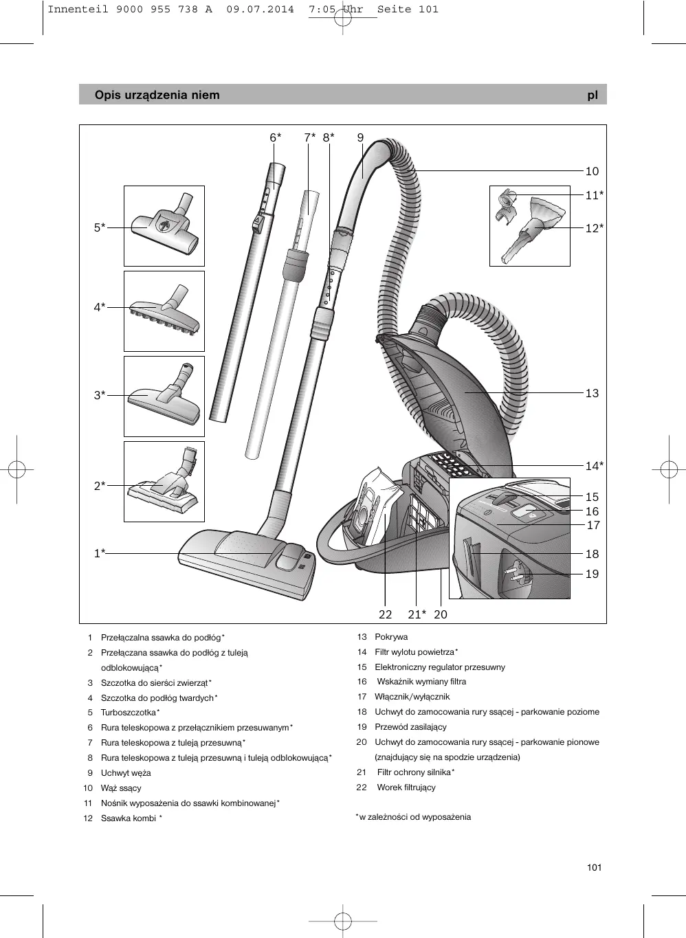 Wskazówki ogólne Wyposażenie Wygląd wyposażenia (szczotki, rury ssącej, itp.) może odbiegać od rysunków w niniejszej instrukcji obsługi, działanie i funkcja nie ulegają zmianie.