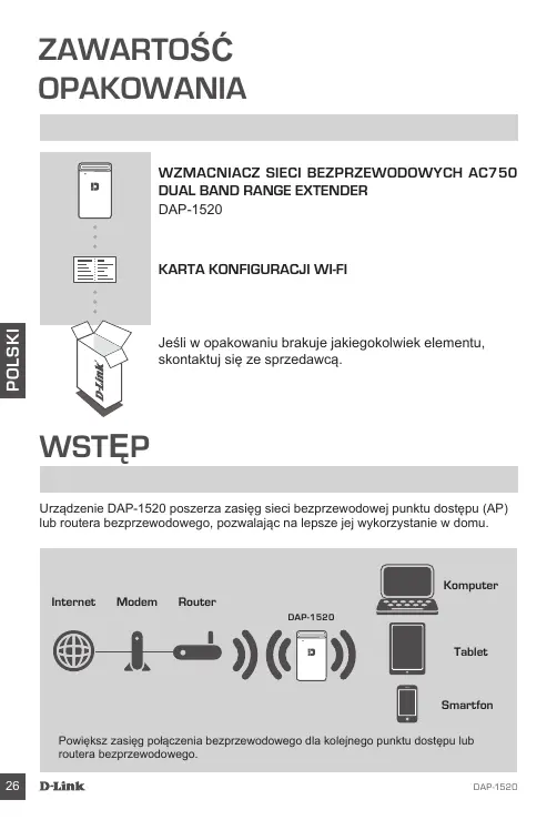 Jeśli w opakowaniu brakuje jakiegokolwiek elementu, skontaktuj się ze sprzedawcą. WSTĘP Urządzenie DAP-1520 poszerza zasięg sieci bezprzewodowej punktu dostępu (AP) lub routera bezprzewodowego, pozwalając na lepsze jej wykorzystanie w domu. Komputer Internet Modem Router DAP-1520 Tablet Smartfon Powiększ zasięg połączenia bezprzewodowego dla kolejnego punktu dostępu lub routera bezprzewodowego.