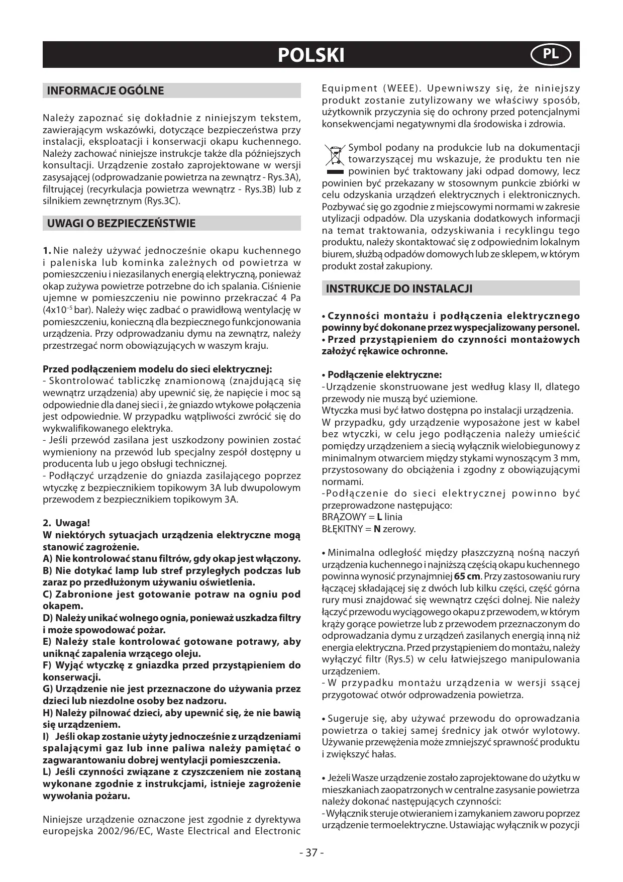 spalającymi gaz lub inne paliwa należy pamiętać o zagwarantowaniu dobrej wentylacji pomieszczenia. L) Jeśli czynności związane z czyszczeniem nie zostaną wykonane zgodnie z instrukcjami, istnieje zagrożenie wywołania pożaru. Niniejsze urządzenie oznaczone jest zgodnie z dyrektywa europejska 2002/96/EC, Waste Electrical and Electronic