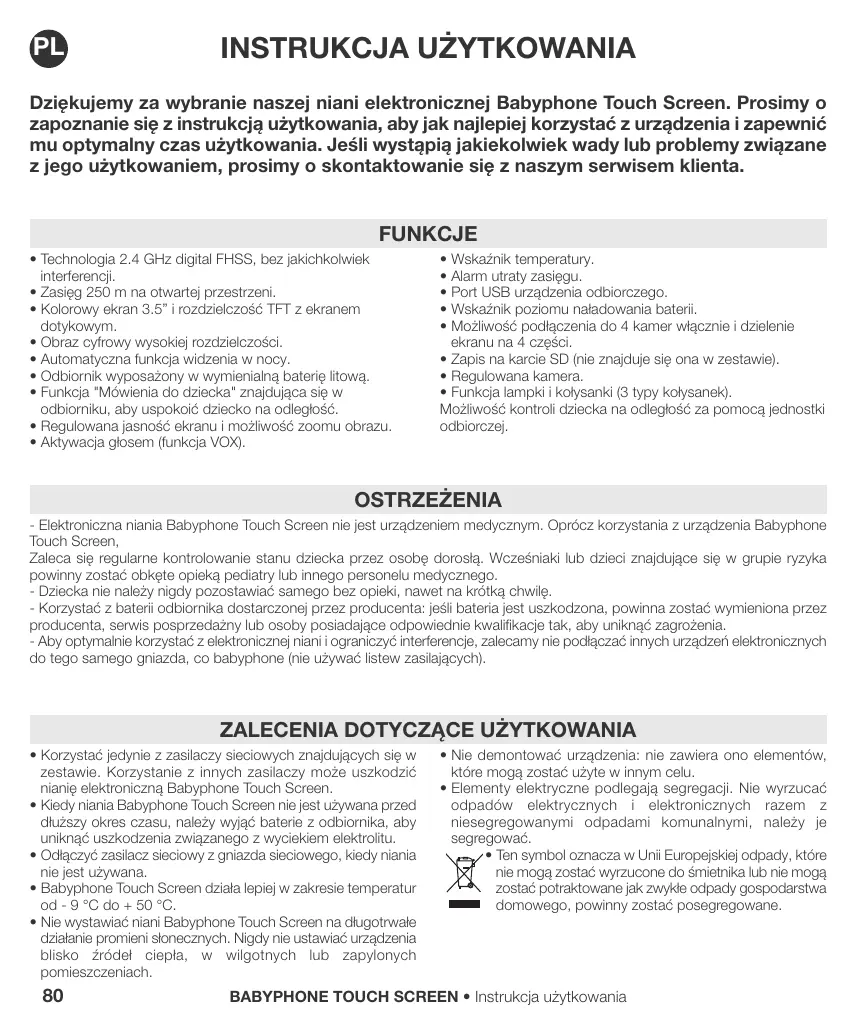 PL INSTRUKCJA UŻYTKOWANIA Dziękujemy za wybranie naszej niani elektronicznej Babyphone Touch Screen. Prosimy o zapoznanie się z instrukcją użytkowania, aby jak najlepiej korzystać z urządzenia i zapewnić mu optymalny czas użytkowania. Jeśli wystąpią jakiekolwiek wady lub problemy związane z jego użytkowaniem, prosimy o skontaktowanie się z naszym serwisem klienta.