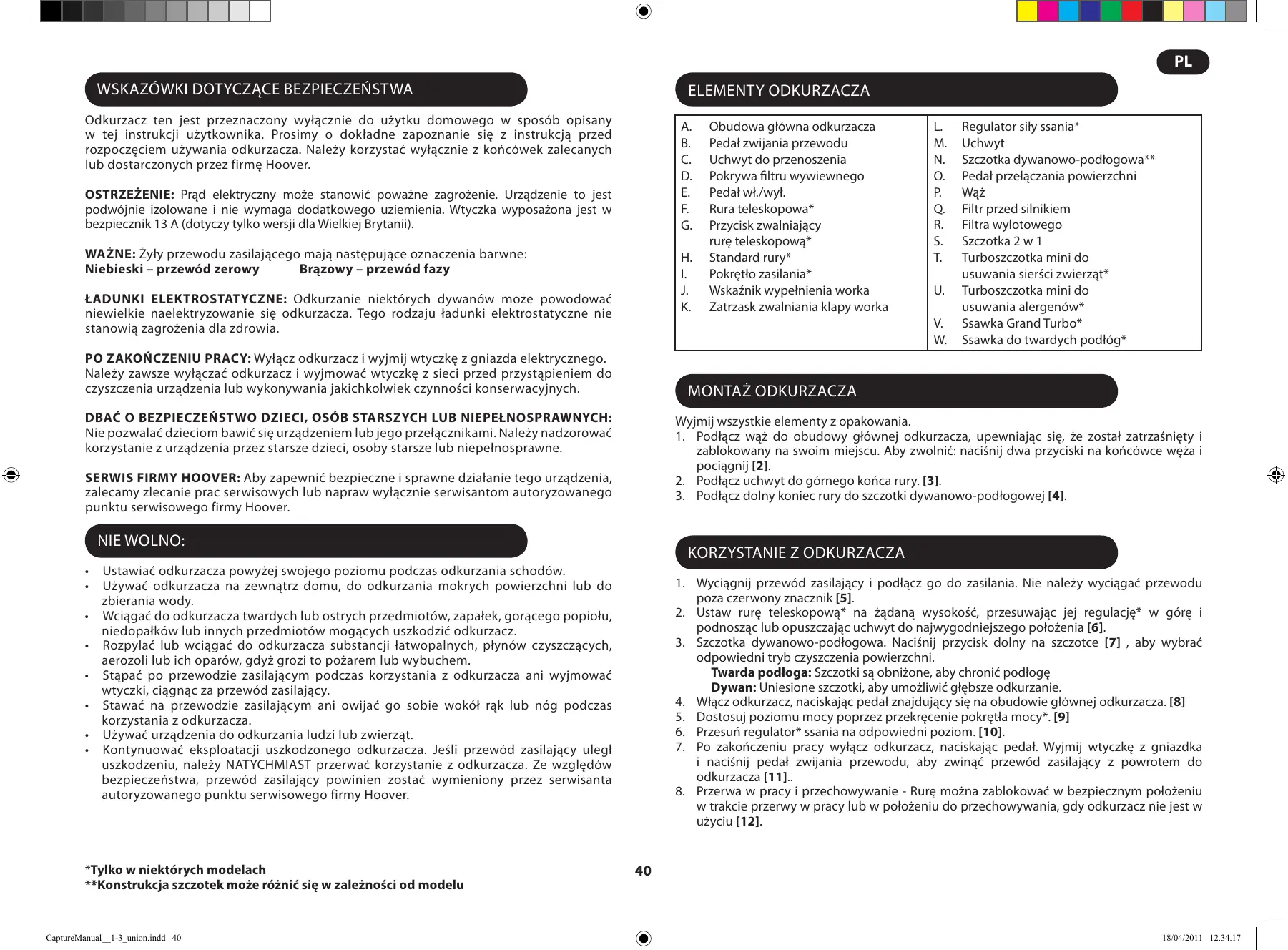 Ustawiać odkurzacza powyżej swojego poziomu podczas odkurzania schodów. Używać odkurzacza na zewnątrz domu, do odkurzania mokrych powierzchni lub do zbierania wody. Wciągać do odkurzacza twardych lub ostrych przedmiotów, zapałek, gorącego popiołu, niedopałków lub innych przedmiotów mogących uszkodzić odkurzacz. Rozpylać lub wciągać do odkurzacza substancji łatwopalnych, płynów czyszczących, aerozoli lub ich oparów, gdyż grozi to pożarem lub wybuchem. Stąpać po przewodzie zasilającym podczas korzystania z odkurzacza ani wyjmować wtyczki, ciągnąc za przewód zasilający. Stawać na przewodzie zasilającym ani owijać go sobie wokół rąk lub nóg podczas korzystania z odkurzacza. Używać urządzenia do odkurzania ludzi lub zwierząt. Kontynuować eksploatacji uszkodzonego odkurzacza. Jeśli przewód zasilający uległ uszkodzeniu, należy NATYCHMIAST przerwać korzystanie z odkurzacza. Ze względów bezpieczeństwa, przewód zasilający powinien zostać wymieniony przez serwisanta autoryzowanego punktu serwisowego firmy Hoover. *Tylko w niektórych modelach **Konstrukcja szczotek może różnić się w zależności od modelu CaptureManual__1-3_union.indd 40