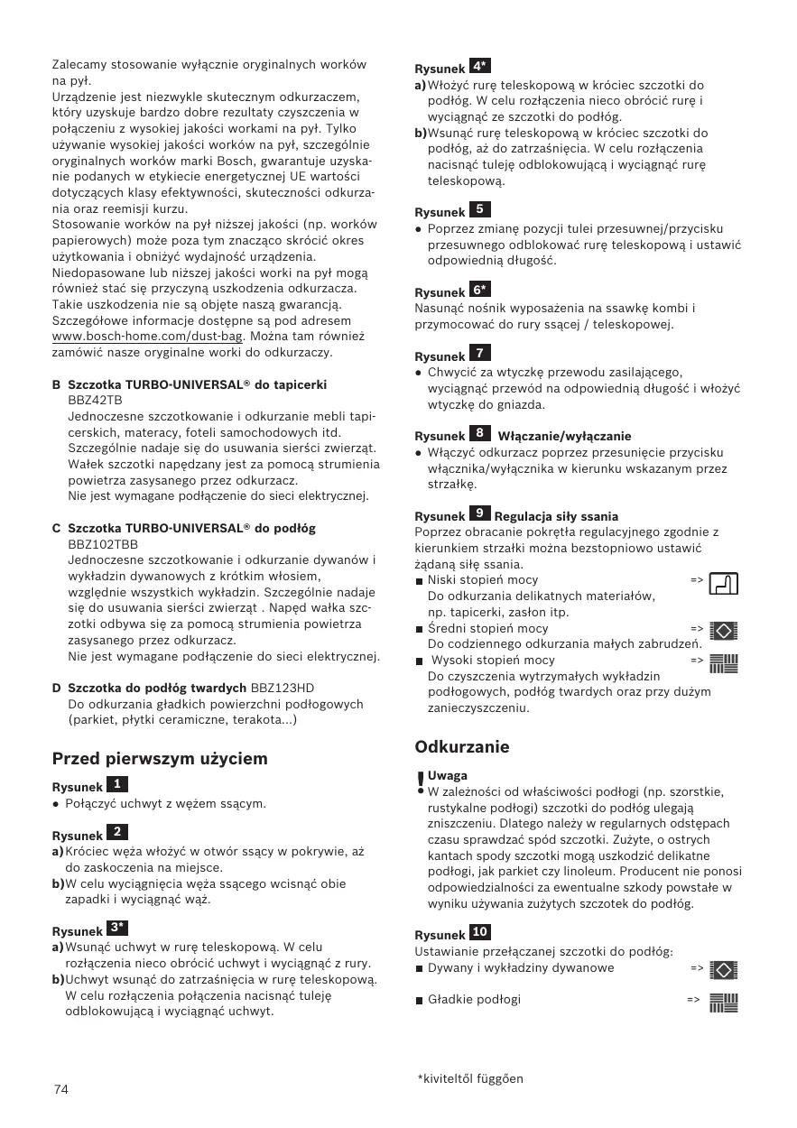 Por favor, guarde o manual de instruções e junte-o ao aspirador sempre que o entregar a terceiros. Nu trageţi de cablul de racord, ci de fişă pentru a scoate aparatul din priza de reţea. Nu trageţi şi nu striviţi cablul de legătură la reţea peste muchii ascuţite. Aveţi grijă ca ştecărul să nu se lovească de persoane, părţi ale corpului, animale sau obiecte la retractarea automată. => Ghidaţi cablul de racordare la reţea cu ajutorul ştecărului. Scoateţi aspiratorul din priză înaintea oricărei lucrări la el. Nu puneţi în funcţiune un aspirator dacă este deteriorat. În cazul existenţei unui deranjament scoateţi ştecherul din priză. Congratulations on your purchase of the Bosch GL40 vacuum cleaner. This instruction manual describes various GL40 models, which means that some of the equipment features and functions described may not apply to your model. You should only use original Bosch accessories, which have been specially developed for your vacuum cleaner, in order to achieve the best possible vacuuming results. Please keep this instruction manual. When passing the vacuum cleaner on to another person, please also hand over this instruction manual. Fold out the picture pages. Cette notice d’utilisation vaut pour différents modèles de la série GL40. Il se peut donc que toutes les caractéristiques et fonctions décrites ne concernent pas toutes votre aspirateur. Utilisez exclusivement les accessoires d'origine Bosch. Ils sont spécialement conçus pour votre aspirateur, afin d'obtenir un résultat de nettoyage optimal. Conservez cette notice d'utilisation. Si vous remettez l'aspirateur à une tierce personne, veuillez-y joindre sa notice d'utilisation. Veuillez déplier les pages illustrées!