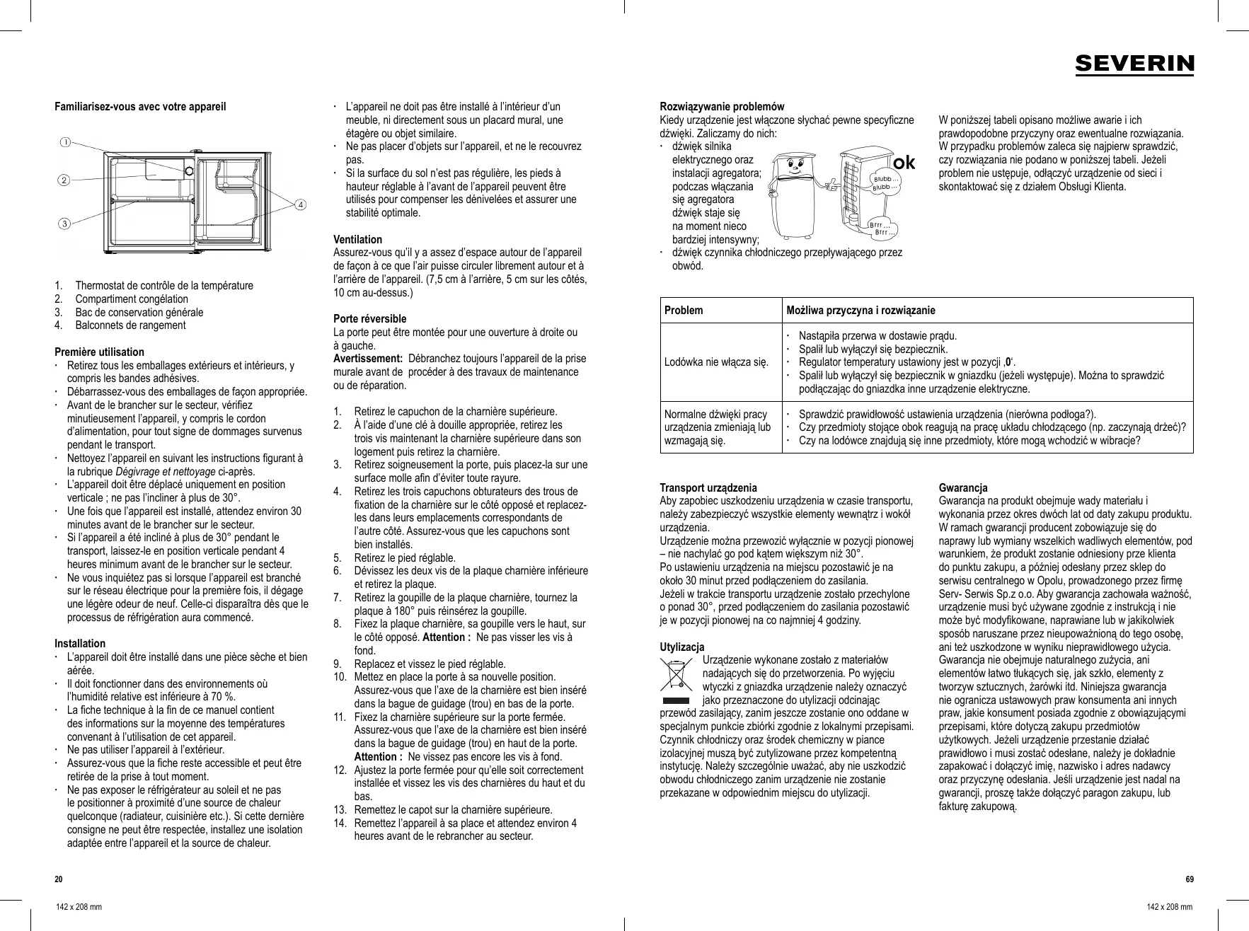 Nastąpiła przerwa w dostawie prądu. Spalił lub wyłączył się bezpiecznik. Regulator temperatury ustawiony jest w pozycji ‚0‘. Spalił lub wyłączył się bezpiecznik w gniazdku (jeżeli występuje). Można to sprawdzić podłączając do gniazdka inne urządzenie elektryczne. ∙ Sprawdzić prawidłowość ustawienia urządzenia (nierówna podłoga?). ∙ Czy przedmioty stojące obok reagują na pracę układu chłodzącego (np. zaczynają drżeć)? ∙ Czy na lodówce znajdują się inne przedmioty, które mogą wchodzić w wibracje? Transport urządzenia Aby zapobiec uszkodzeniu urządzenia w czasie transportu, należy zabezpieczyć wszystkie elementy wewnątrz i wokół urządzenia. Urządzenie można przewozić wyłącznie w pozycji pionowej – nie nachylać go pod kątem większym niż 30°. Po ustawieniu urządzenia na miejscu pozostawić je na około 30 minut przed podłączeniem do zasilania. Jeżeli w trakcie transportu urządzenie zostało przechylone o ponad 30°, przed podłączeniem do zasilania pozostawić je w pozycji pionowej na co najmniej 4 godziny. Utylizacja Urządzenie wykonane zostało z materiałów nadających się do przetworzenia. Po wyjęciu wtyczki z gniazdka urządzenie należy oznaczyć jako przeznaczone do utylizacji odcinając przewód zasilający, zanim jeszcze zostanie ono oddane w specjalnym punkcie zbiórki zgodnie z lokalnymi przepisami. Czynnik chłodniczy oraz środek chemiczny w piance izolacyjnej muszą być zutylizowane przez kompetentną instytucję. Należy szczególnie uważać, aby nie uszkodzić obwodu chłodniczego zanim urządzenie nie zostanie przekazane w odpowiednim miejscu do utylizacji. Gwarancja Gwarancja na produkt obejmuje wady materiału i wykonania przez okres dwóch lat od daty zakupu produktu. W ramach gwarancji producent zobowiązuje się do naprawy lub wymiany wszelkich wadliwych elementów, pod warunkiem, że produkt zostanie odniesiony prze klienta do punktu zakupu, a później odesłany przez sklep do serwisu centralnego w Opolu, prowadzonego przez firmę Serv- Serwis Sp.z o.o. Aby gwarancja zachowała ważność, urządzenie musi być używane zgodnie z instrukcją i nie może być modyfikowane, naprawiane lub w jakikolwiek sposób naruszane przez nieupoważnioną do tego osobę, ani też uszkodzone w wyniku nieprawidłowego użycia. Gwarancja nie obejmuje naturalnego zużycia, ani elementów łatwo tłukących się, jak szkło, elementy z tworzyw sztucznych, żarówki itd. Niniejsza gwarancja nie ogranicza ustawowych praw konsumenta ani innych praw, jakie konsument posiada zgodnie z obowiązującymi przepisami, które dotyczą zakupu przedmiotów użytkowych. Jeżeli urządzenie przestanie działać prawidłowo i musi zostać odesłane, należy je dokładnie zapakować i dołączyć imię, nazwisko i adres nadawcy oraz przyczynę odesłania. Jeśli urządzenie jest nadal na gwarancji, proszę także dołączyć paragon zakupu, lub fakturę zakupową.