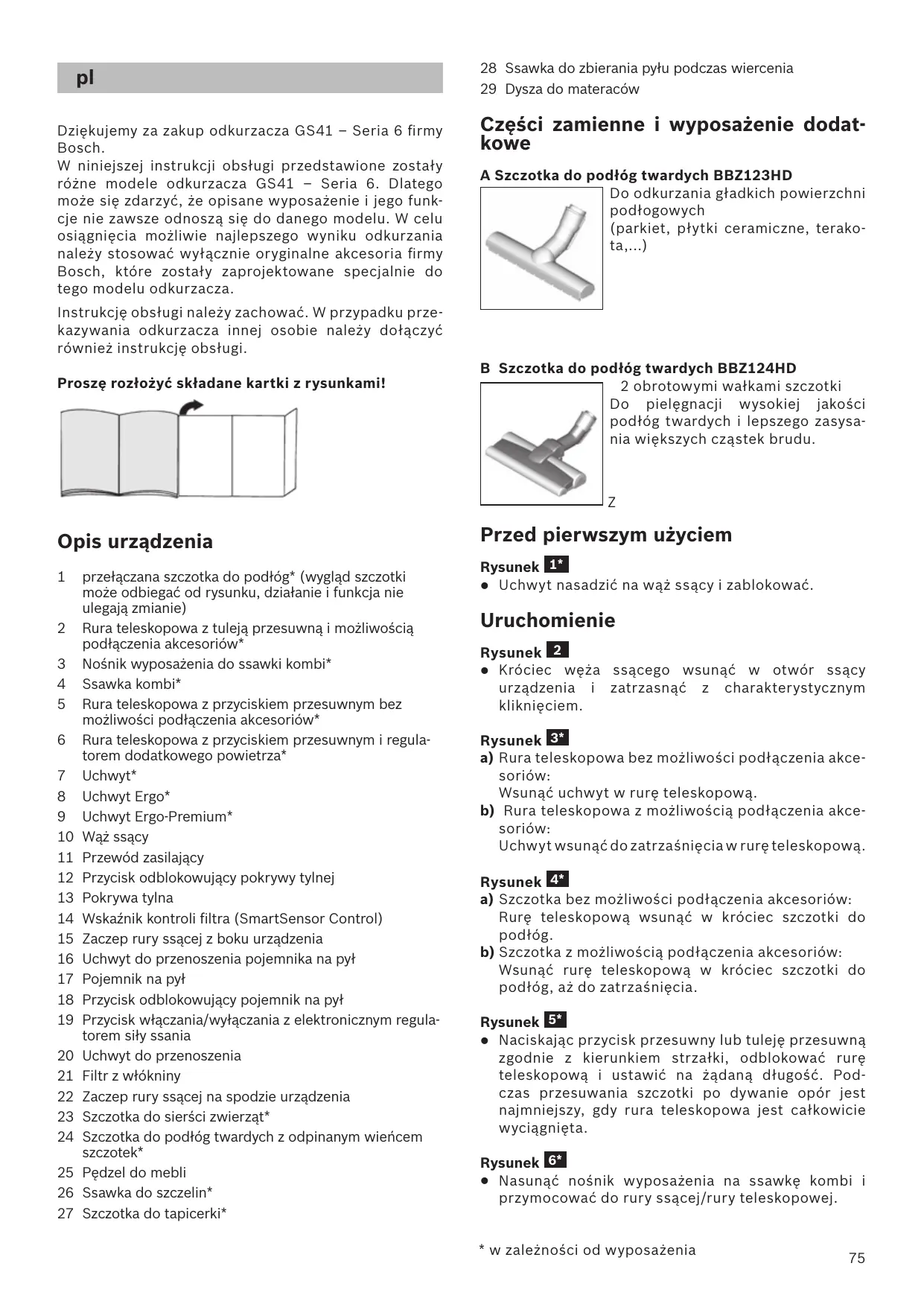 Conservare le istruzioni per l'uso. In caso di cessione dell'aspirapolvere a terzi, si raccomanda di consegnare anche le istruzioni per l'uso. Die Gebrauchsanweisung bitte aufbewahren. Bei Weitergabe des Staubsaugers an Dritte bitte Gebrauchsanweisung mitgeben. Congratulations on your purchase of a Bosch vacuum cleaner from the GS41 – Serie 6 series. This instruction manual describes various GS41 – Serie 6 models, which means that some of the equipment features and functions described may not apply to your model. You should only use genuine Bosch accessories – these have been specially developed for your vacuum cleaner to achieve the best possible vacuuming results. Please keep this instruction manual for future reference. When giving the vacuum cleaner to a third party, please also pass on this instruction manual. GS41 – Serie 6. Il se peut donc que toutes les caractéristiques et les fonctions décrites ici ne concernent pas votre aspirateur. Utilisez exclusivement les accessoires d'origine Bosch. Ils sont spécialement conçus pour votre aspirateur, pour vous permettre d'obtenir un résultat de nettoyage optimal. Conservez la présente notice d'utilisation. Si vous remettez l'aspirateur à une tierce personne, veuillez-y joindre sa notice d'utilisation. Veuillez déplier les volets illustrés !