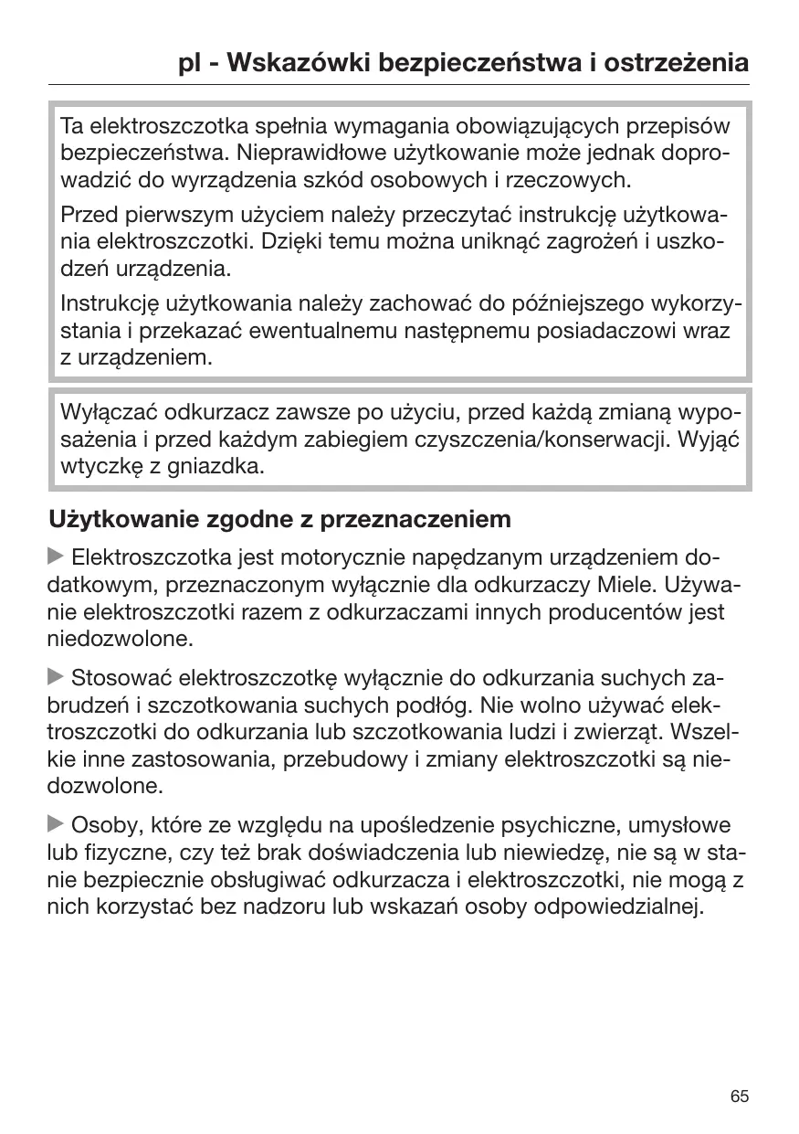 Użytkowanie zgodne z przeznaczeniem Elektroszczotka jest motorycznie napędzanym urządzeniem dodatkowym, przeznaczonym wyłącznie dla odkurzaczy Miele. Używanie elektroszczotki razem z odkurzaczami innych producentów jest niedozwolone. Stosować elektroszczotkę wyłącznie do odkurzania suchych zabrudzeń i szczotkowania suchych podłóg. Nie wolno używać elektroszczotki do odkurzania lub szczotkowania ludzi i zwierząt. Wszelkie inne zastosowania, przebudowy i zmiany elektroszczotki są niedozwolone. Osoby, które ze względu na upośledzenie psychiczne, umysłowe lub fizyczne, czy też brak doświadczenia lub niewiedzę, nie są w stanie bezpiecznie obsługiwać odkurzacza i elektroszczotki, nie mogą z nich korzystać bez nadzoru lub wskazań osoby odpowiedzialnej.