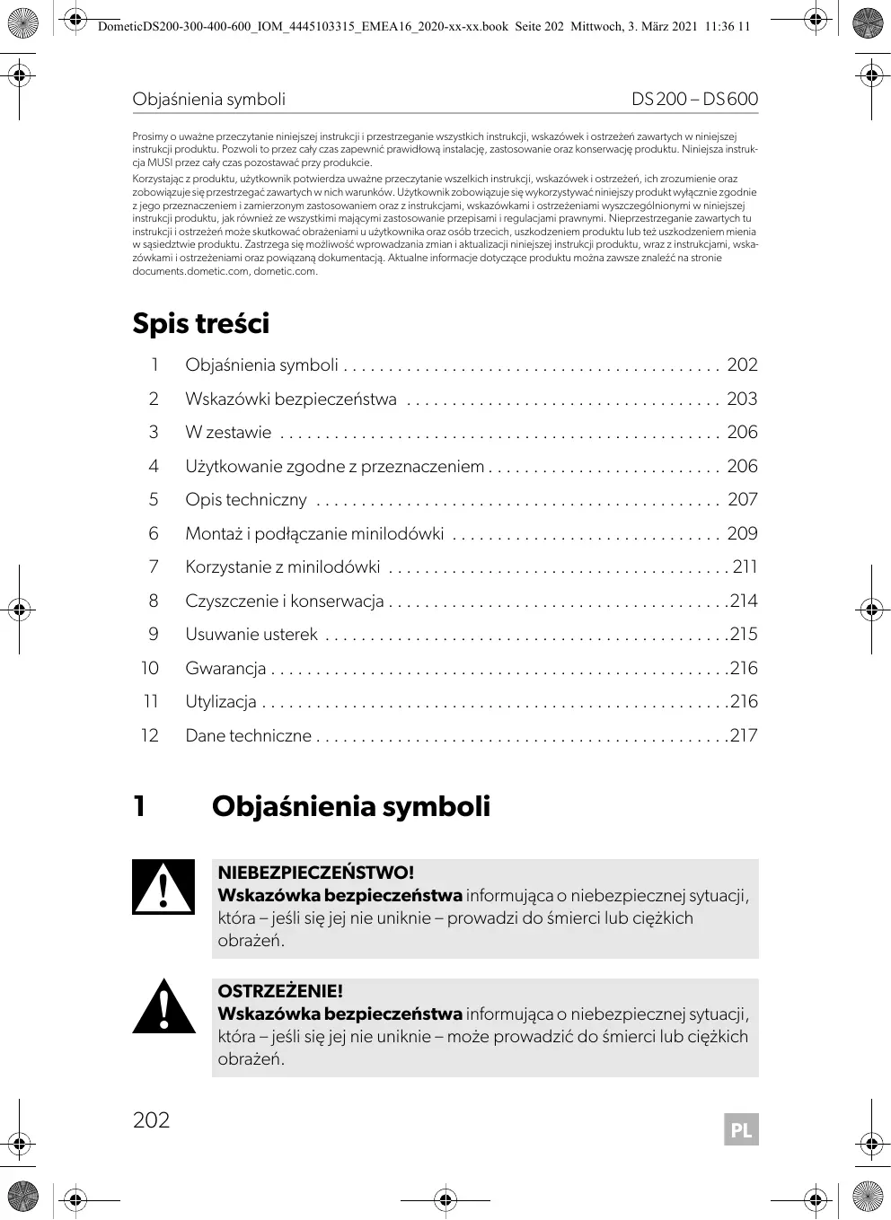 Prosimy o uważne przeczytanie niniejszej instrukcji i przestrzeganie wszystkich instrukcji, wskazówek i ostrzeżeń zawartych w niniejszej instrukcji produktu. Pozwoli to przez cały czas zapewnić prawidłową instalację, zastosowanie oraz konserwację produktu. Niniejsza instrukcja MUSI przez cały czas pozostawać przy produkcie. Korzystając z produktu, użytkownik potwierdza uważne przeczytanie wszelkich instrukcji, wskazówek i ostrzeżeń, ich zrozumienie oraz zobowiązuje się przestrzegać zawartych w nich warunków. Użytkownik zobowiązuje się wykorzystywać niniejszy produkt wyłącznie zgodnie z jego przeznaczeniem i zamierzonym zastosowaniem oraz z instrukcjami, wskazówkami i ostrzeżeniami wyszczególnionymi w niniejszej instrukcji produktu, jak również ze wszystkimi mającymi zastosowanie przepisami i regulacjami prawnymi. Nieprzestrzeganie zawartych tu instrukcji i ostrzeżeń może skutkować obrażeniami u użytkownika oraz osób trzecich, uszkodzeniem produktu lub też uszkodzeniem mienia w sąsiedztwie produktu. Zastrzega się możliwość wprowadzania zmian i aktualizacji niniejszej instrukcji produktu, wraz z instrukcjami, wskazówkami i ostrzeżeniami oraz powiązaną dokumentacją. Aktualne informacje dotyczące produktu można zawsze znaleźć na stronie documents.dometic.com, dometic.com.