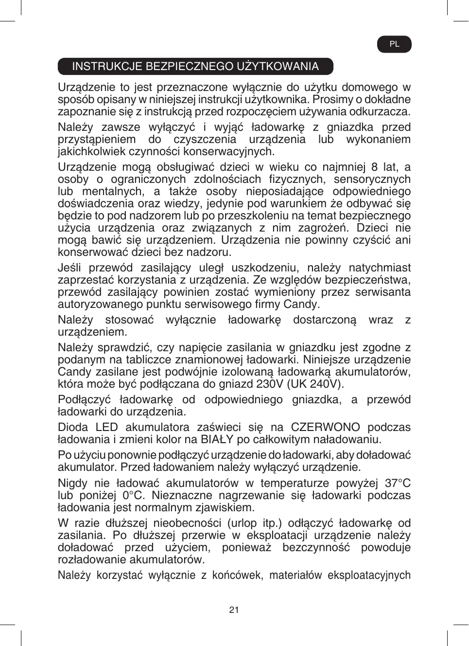Urządzenie to jest przeznaczone wyłącznie do użytku domowego w sposób opisany w niniejszej instrukcji użytkownika. Prosimy o dokładne zapoznanie się z instrukcją przed rozpoczęciem używania odkurzacza. Należy zawsze wyłączyć i wyjąć ładowarkę z gniazdka przed przystąpieniem do czyszczenia urządzenia lub wykonaniem jakichkolwiek czynności konserwacyjnych. Urządzenie mogą obsługiwać dzieci w wieku co najmniej 8 lat, a osoby o ograniczonych zdolnościach fizycznych, sensorycznych lub mentalnych, a także osoby nieposiadające odpowiedniego doświadczenia oraz wiedzy, jedynie pod warunkiem że odbywać się będzie to pod nadzorem lub po przeszkoleniu na temat bezpiecznego użycia urządzenia oraz związanych z nim zagrożeń. Dzieci nie mogą bawić się urządzeniem. Urządzenia nie powinny czyścić ani konserwować dzieci bez nadzoru. Jeśli przewód zasilający uległ uszkodzeniu, należy natychmiast zaprzestać korzystania z urządzenia. Ze względów bezpieczeństwa, przewód zasilający powinien zostać wymieniony przez serwisanta autoryzowanego punktu serwisowego firmy Candy. Należy stosować wyłącznie ładowarkę dostarczoną wraz z urządzeniem. Należy sprawdzić, czy napięcie zasilania w gniazdku jest zgodne z podanym na tabliczce znamionowej ładowarki. Niniejsze urządzenie Candy zasilane jest podwójnie izolowaną ładowarką akumulatorów, która może być podłączana do gniazd 230V (UK 240V). Podłączyć ładowarkę od odpowiedniego gniazdka, a przewód ładowarki do urządzenia. Dioda LED akumulatora zaświeci się na CZERWONO podczas ładowania i zmieni kolor na BIAŁY po całkowitym naładowaniu. Po użyciu ponownie podłączyć urządzenie do ładowarki, aby doładować akumulator. Przed ładowaniem należy wyłączyć urządzenie. Nigdy nie ładować akumulatorów w temperaturze powyżej 37°C lub poniżej 0°C. Nieznaczne nagrzewanie się ładowarki podczas ładowania jest normalnym zjawiskiem. W razie dłuższej nieobecności (urlop itp.) odłączyć ładowarkę od zasilania. Po dłuższej przerwie w eksploatacji urządzenie należy doładować przed użyciem, ponieważ bezczynność powoduje rozładowanie akumulatorów. Należy korzystać wyłącznie z końcówek, materiałów eksploatacyjnych